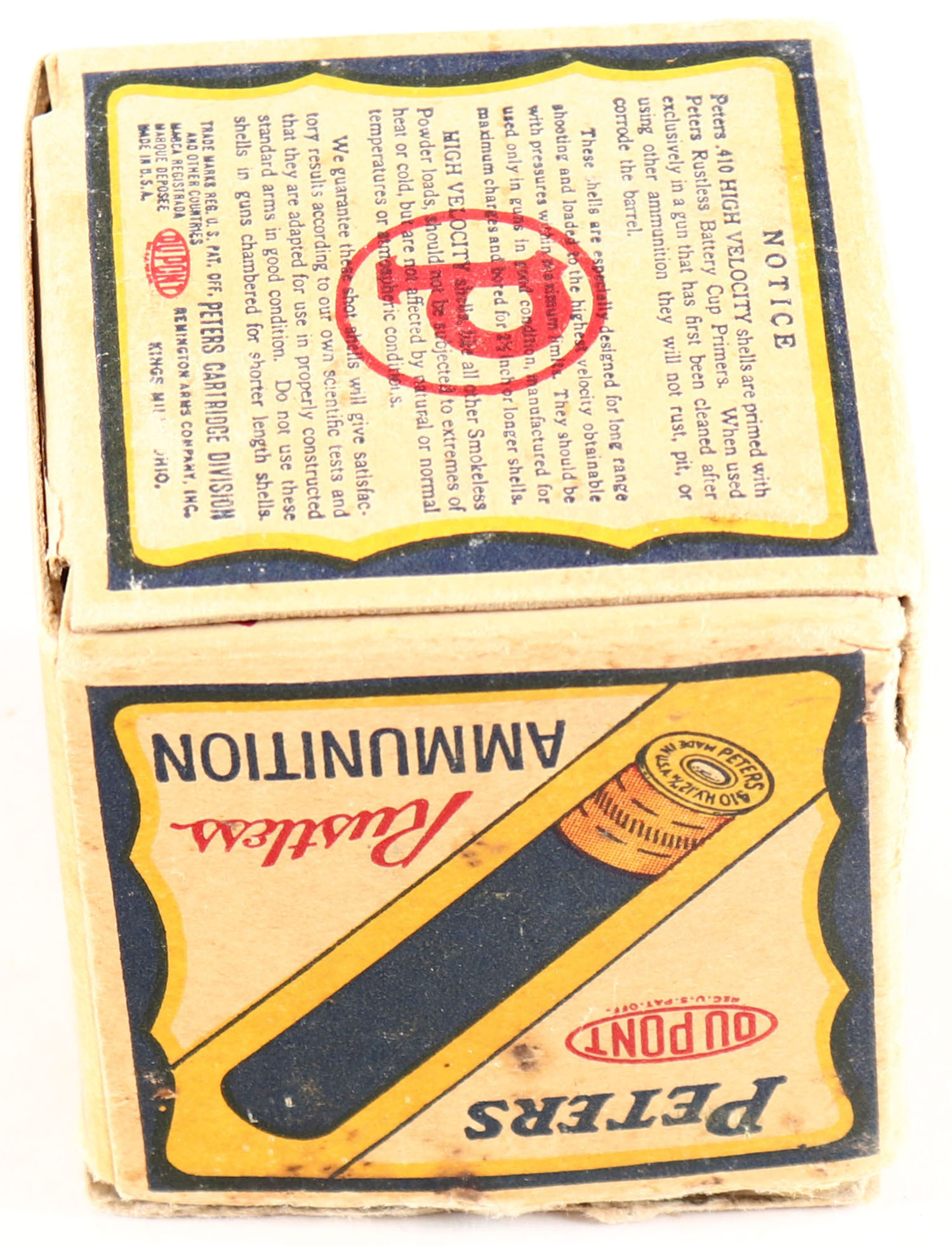 Peters Cart., High Velocity, 410ga., 2 1/2'', 1pc., Full, shot size 5CH & 7 Rds. Of shot size 4CH, multi colored box that pictures mallard flying out of the marsh grass, No Duvrock sides, box has torn top flap, shells are excellent. Grade: Very Good ++ - Value: 300 to 800