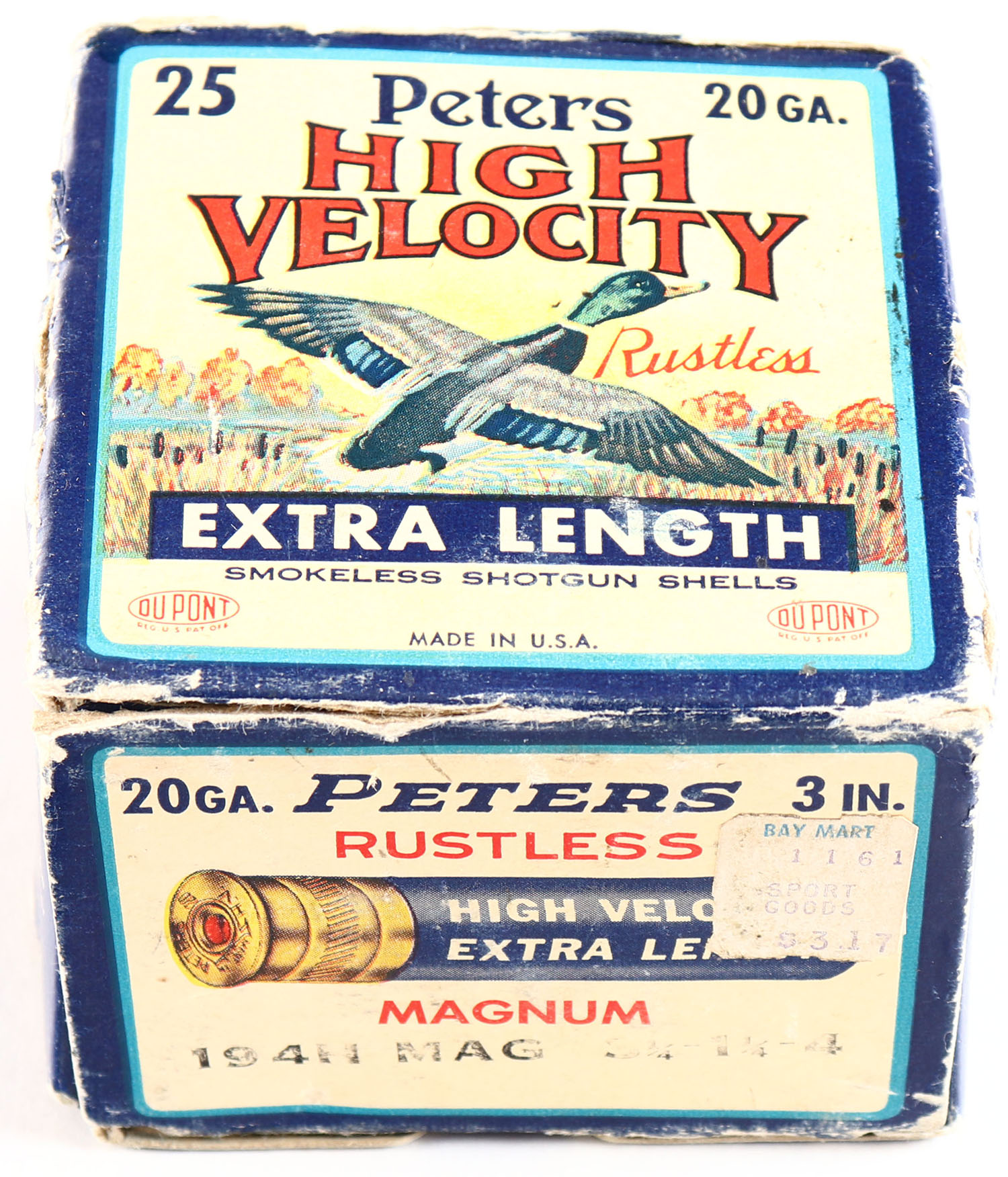 Peters Cart. Co., Bridgeport, CT, High Velocity, 20ga., 1pc., Partial 20 rds., shot size 4, multi colored box that pictures mallard flying out of the marsh grass, box has light age soiling and shell protrusions, box has torn flaps, shells are very good. Grade: Very Good - Value: 20 to 60