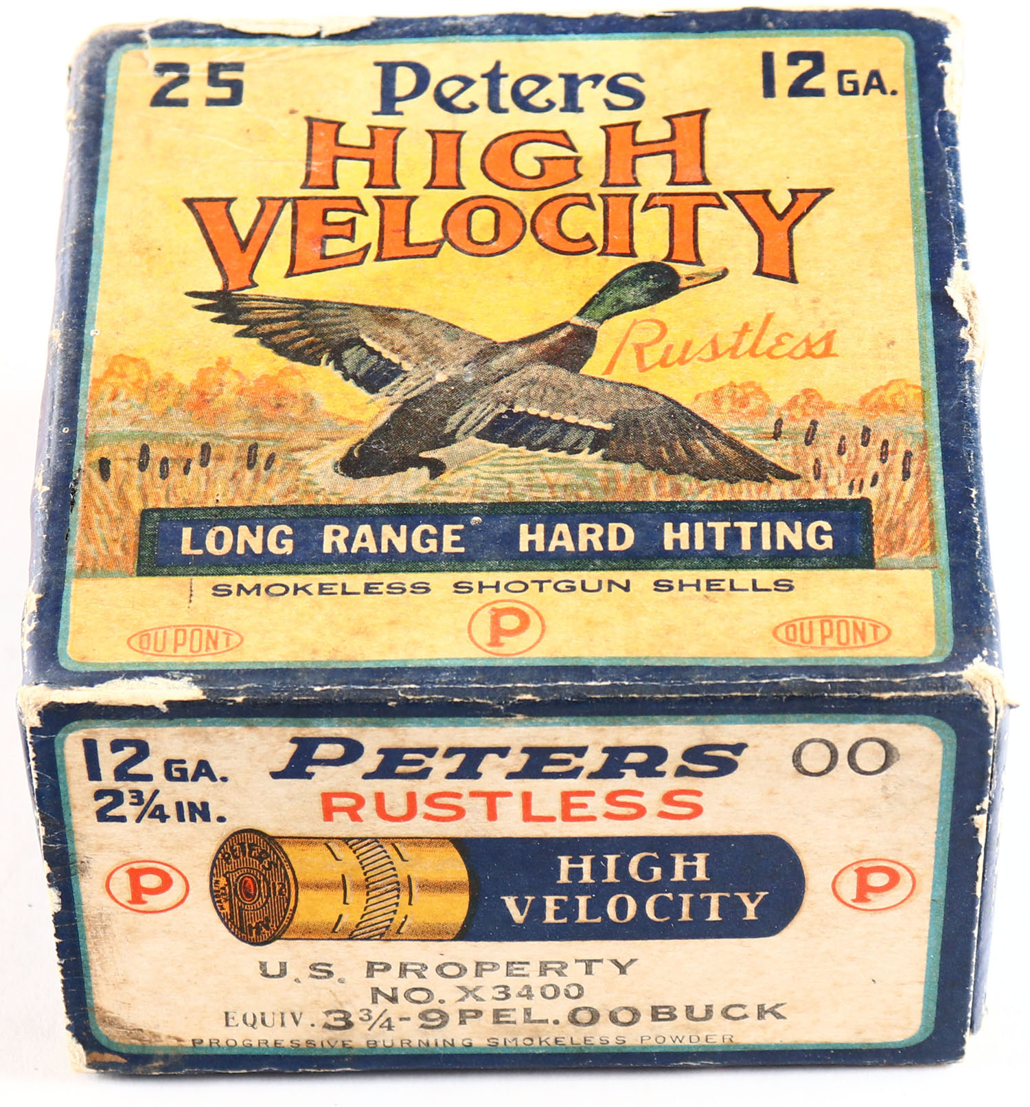 Peters Cart. Co., King Mills, OH, High Velocity, 12ga., 2 3/4'', 1pc., Full, shot size 00 BUCK, multi colored box that pictures mallard flying out of the marsh grass, box shows wear with nice colors, shells are excellent. Grade: Very Good ++ - Value: 40 to 100