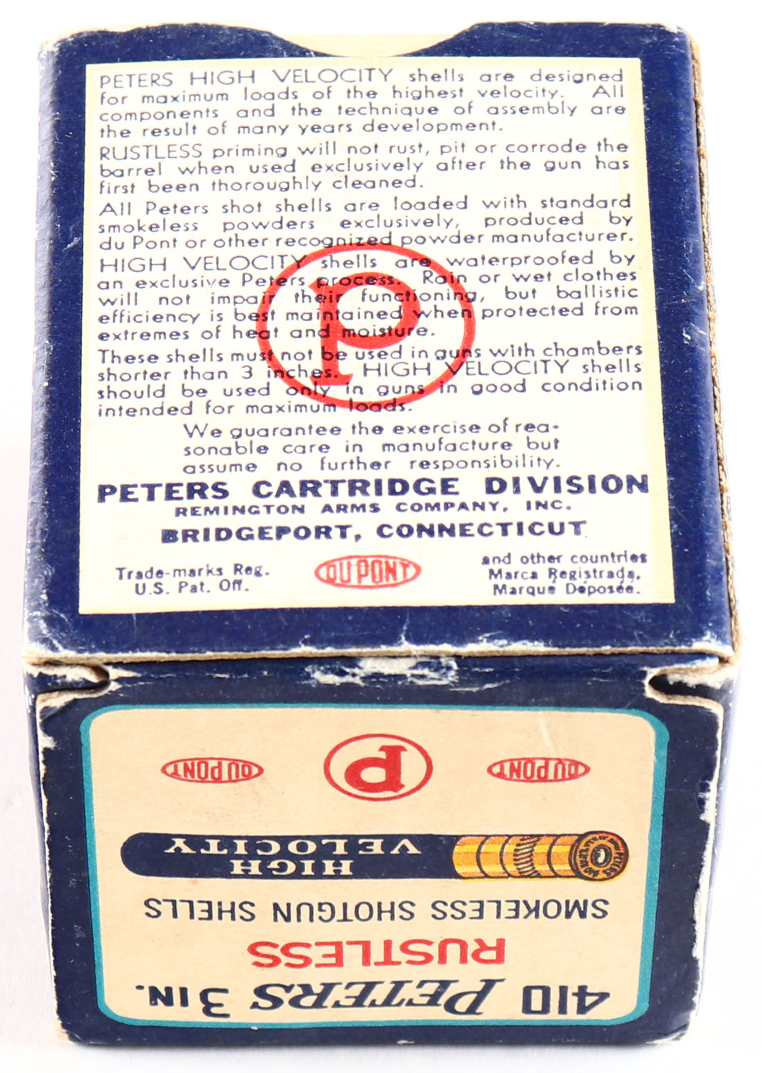 Peters, High Velocity, 410ga., 3'', 1pc., Full, shot size 7 1/2, multi-colored box with mallard duck flying out of marsh grass, box has great colors with light edge wear & light soiling, Shells are excellent. Grade: Excellent + - Value: 40 to 100