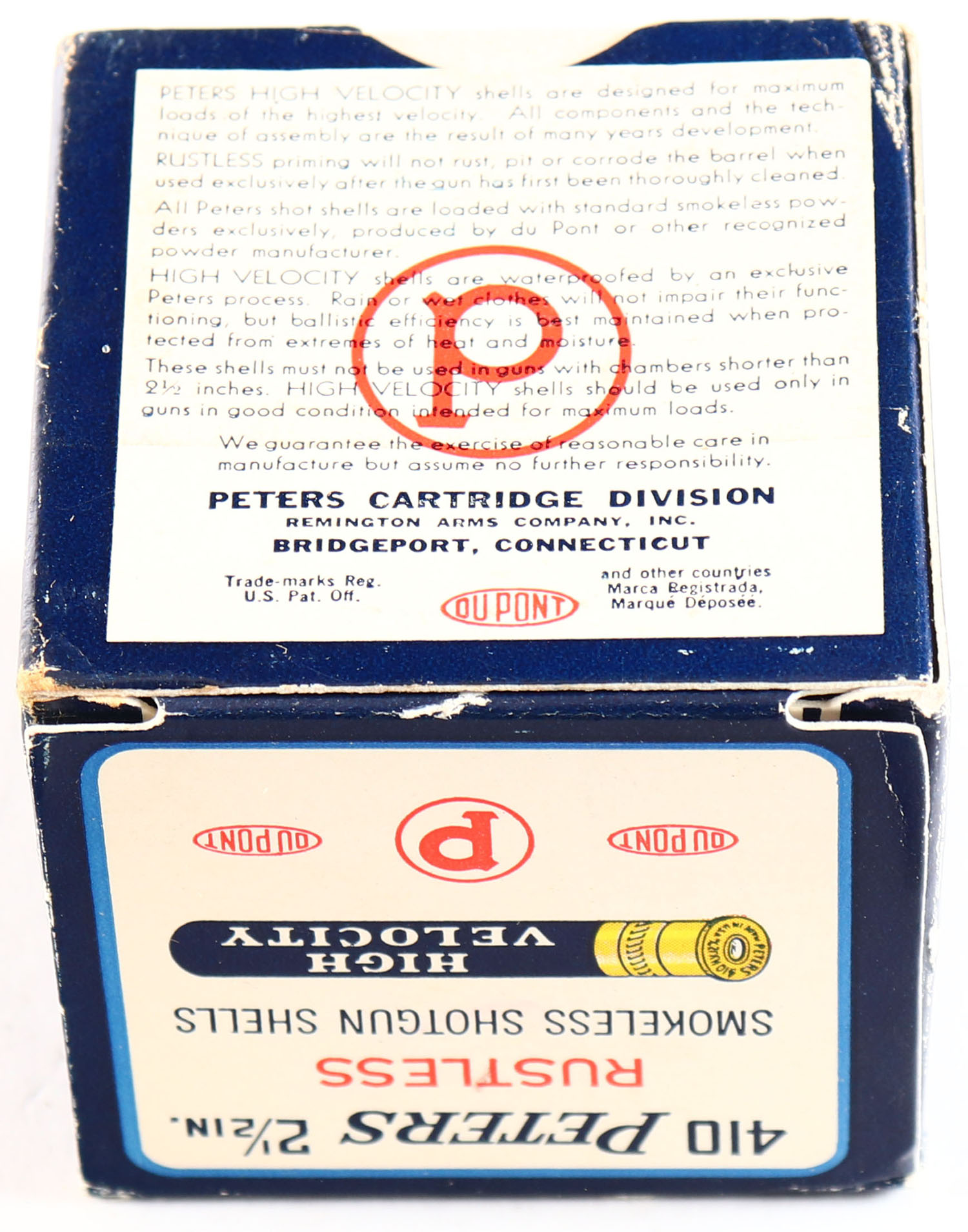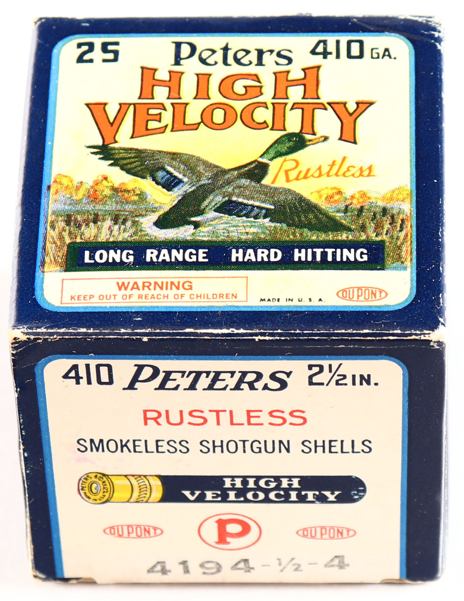 Peters, High Velocity, 410ga., 2 1/2'', 1pc., Full, shot size 4, multi-colored box with mallard duck flying out of marsh grass, box is very solid with great colors, Shells are excellent. Grade: Excellent ++ - Value: 40 to 100
