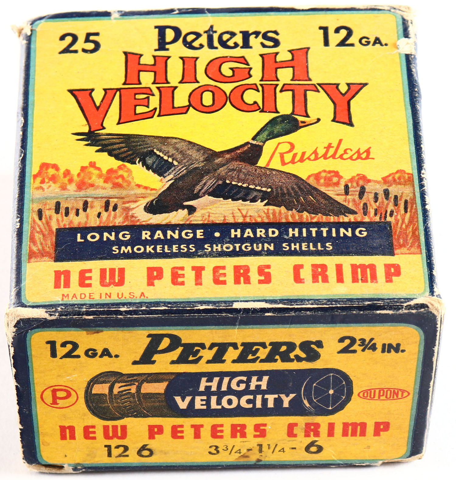 Peters Cart. Co., High Velocity, New Peters Crimp, 12ga., 1pc., Full, shot size 6, multi colored box that pictures mallard flying out of the marsh grass, box is solid with edge wear & light age soiling, Shells are very good. Grade: Very Good ++ - Value: 20 to 80