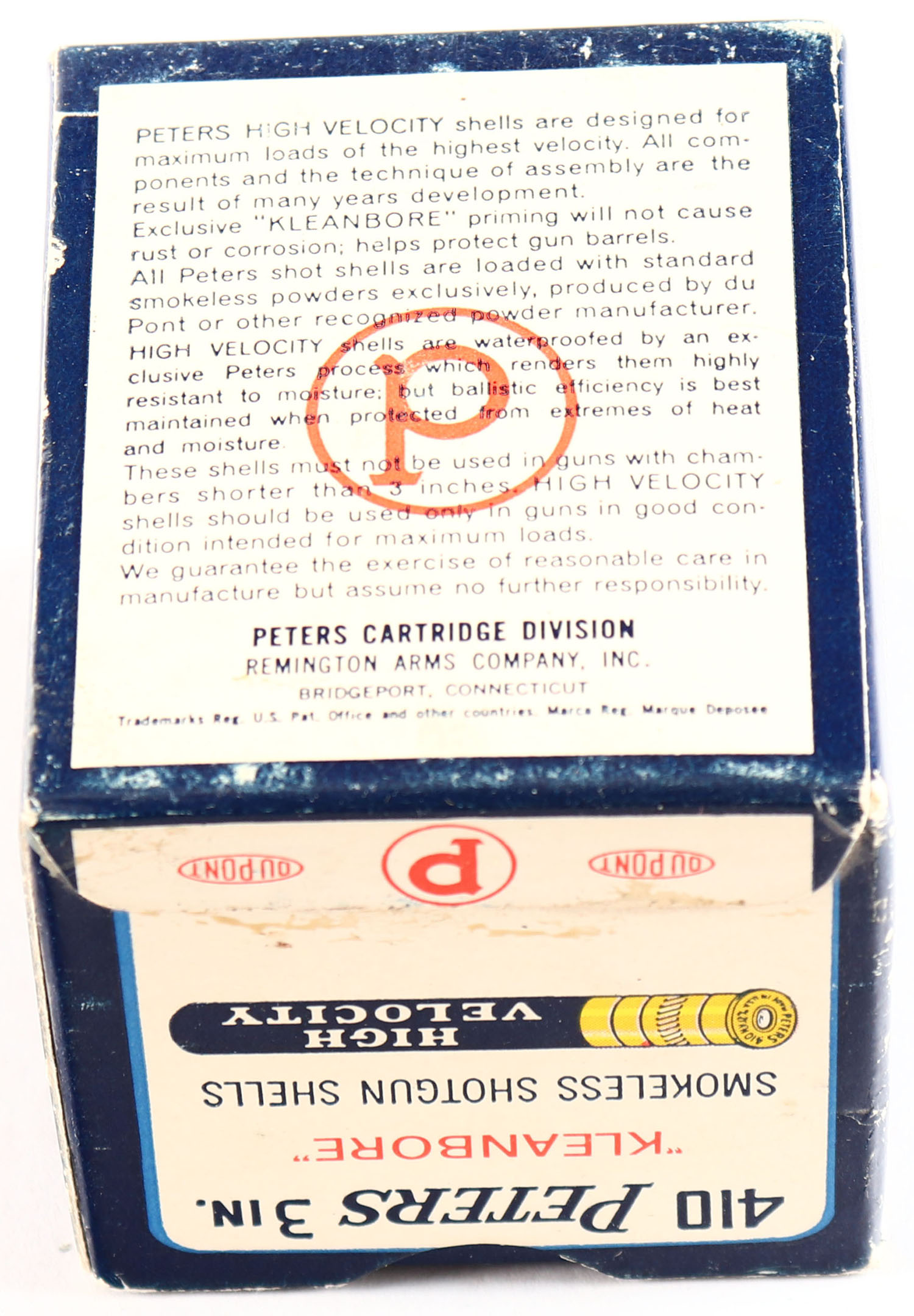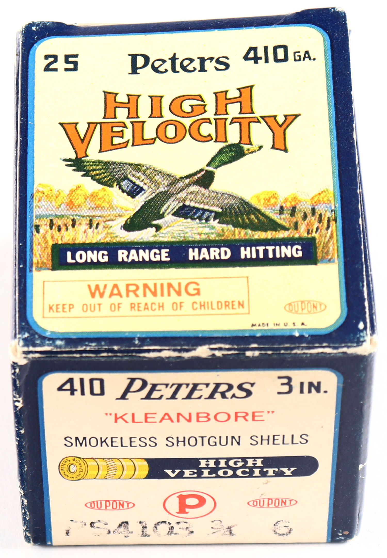 Peters, High Velocity, 410ga., 3 in., 1pc., Full, shot size 6, multi-colored box with mallard duck flying out of marsh grass, box is very solid with great colors, shells are excellent. Grade: Excellent + - Value: 20 to 100