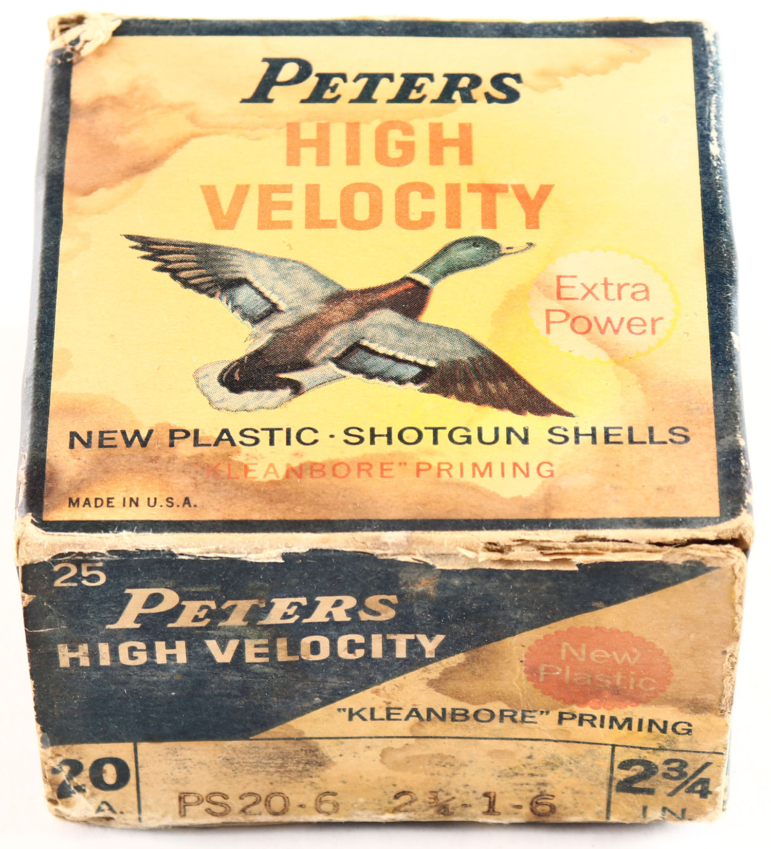 Peters Cart. Co., High Velocity, 20ga, 2 3/4'', 1pc., Full, shot size 6, multi colored box that pictures mallard flying, box has soiling, shells are good. Grade: Good - Value: 10 to 20