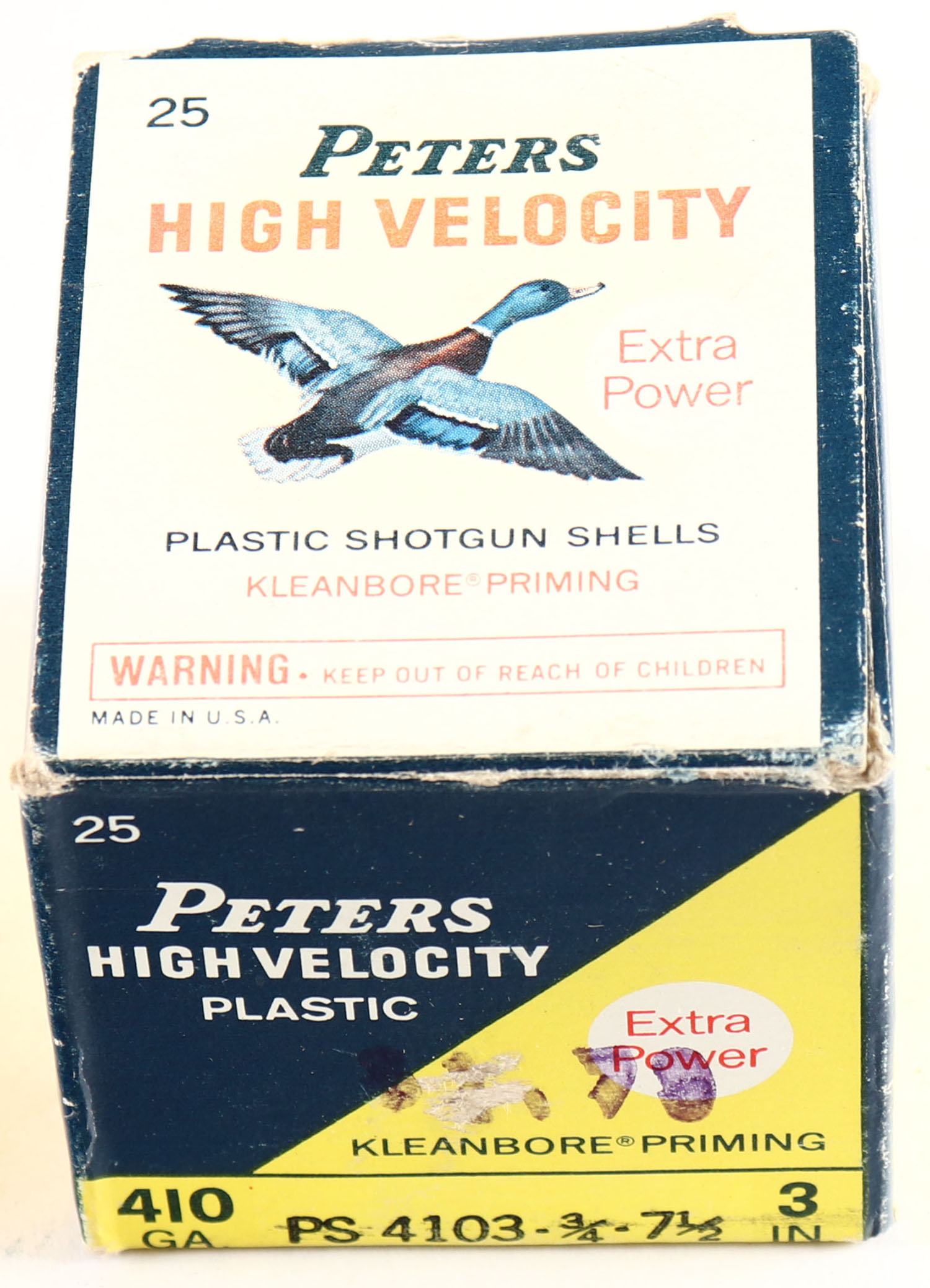 Peters Cart. Co., High Velocity, 410ga, 3'', 1pc., Full, shot size 7 1/2, multi colored box that pictures mallard flying, box is solid with edge wear, scuffing, soiling & very nice color, shells are very good. Grade: Very Good + - Value: 10 to 30