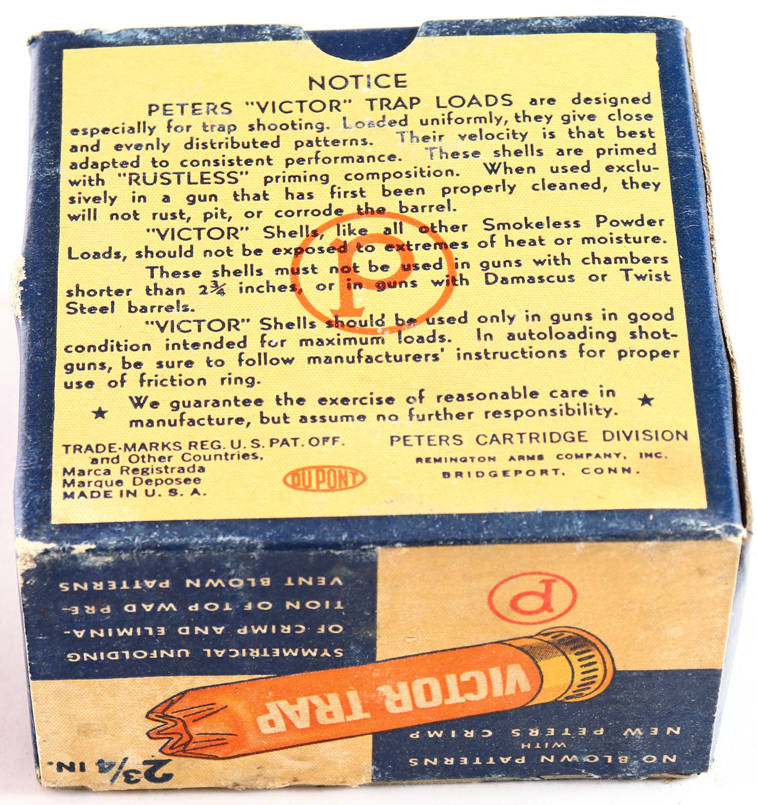 Peters, VICTOR TRAP, 12ga., 1pc., Full, shot size 7 1/2, blue, white & orange box, box has age soiling with light edge wear, shells are excellent. Grade: Very Good ++ - Value: 10 to 40