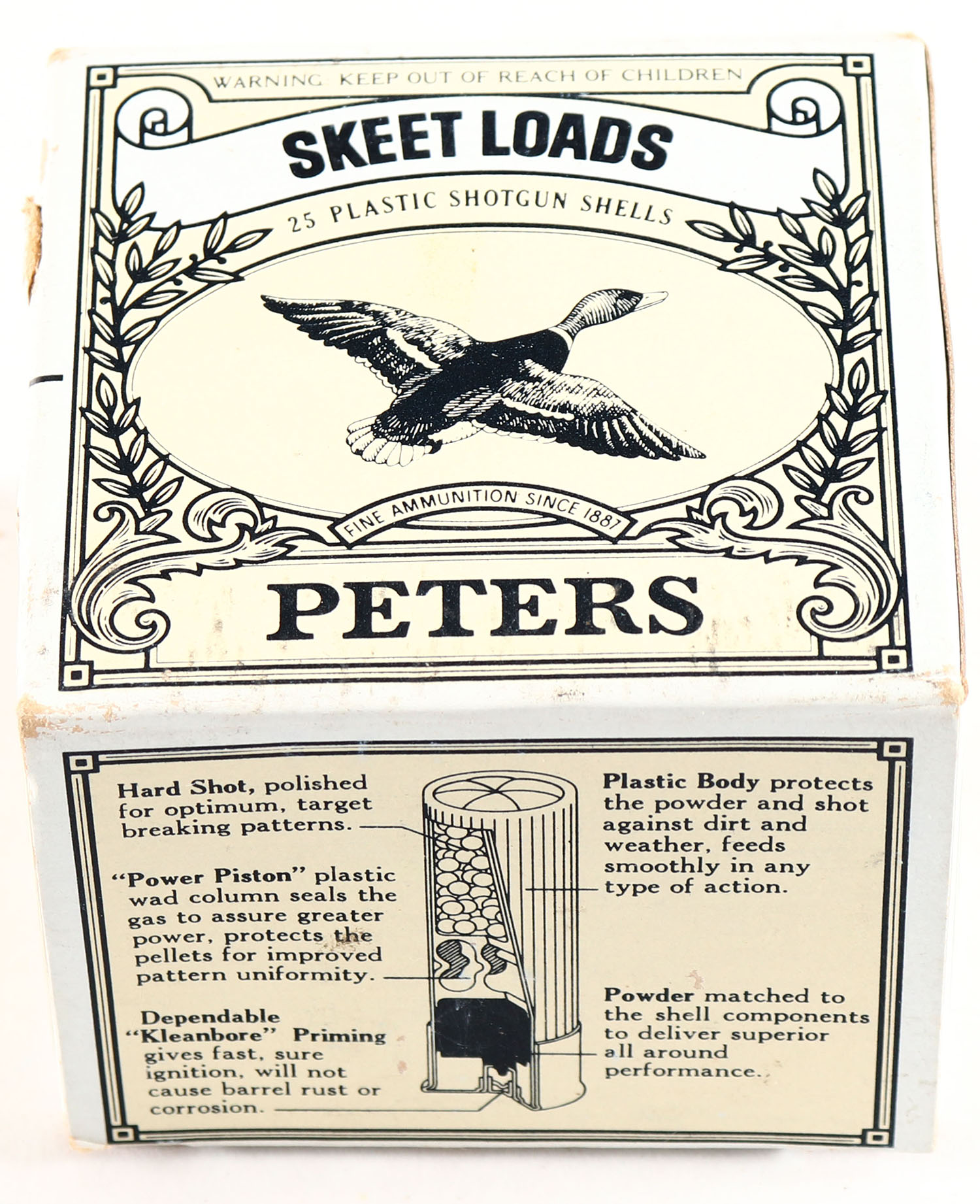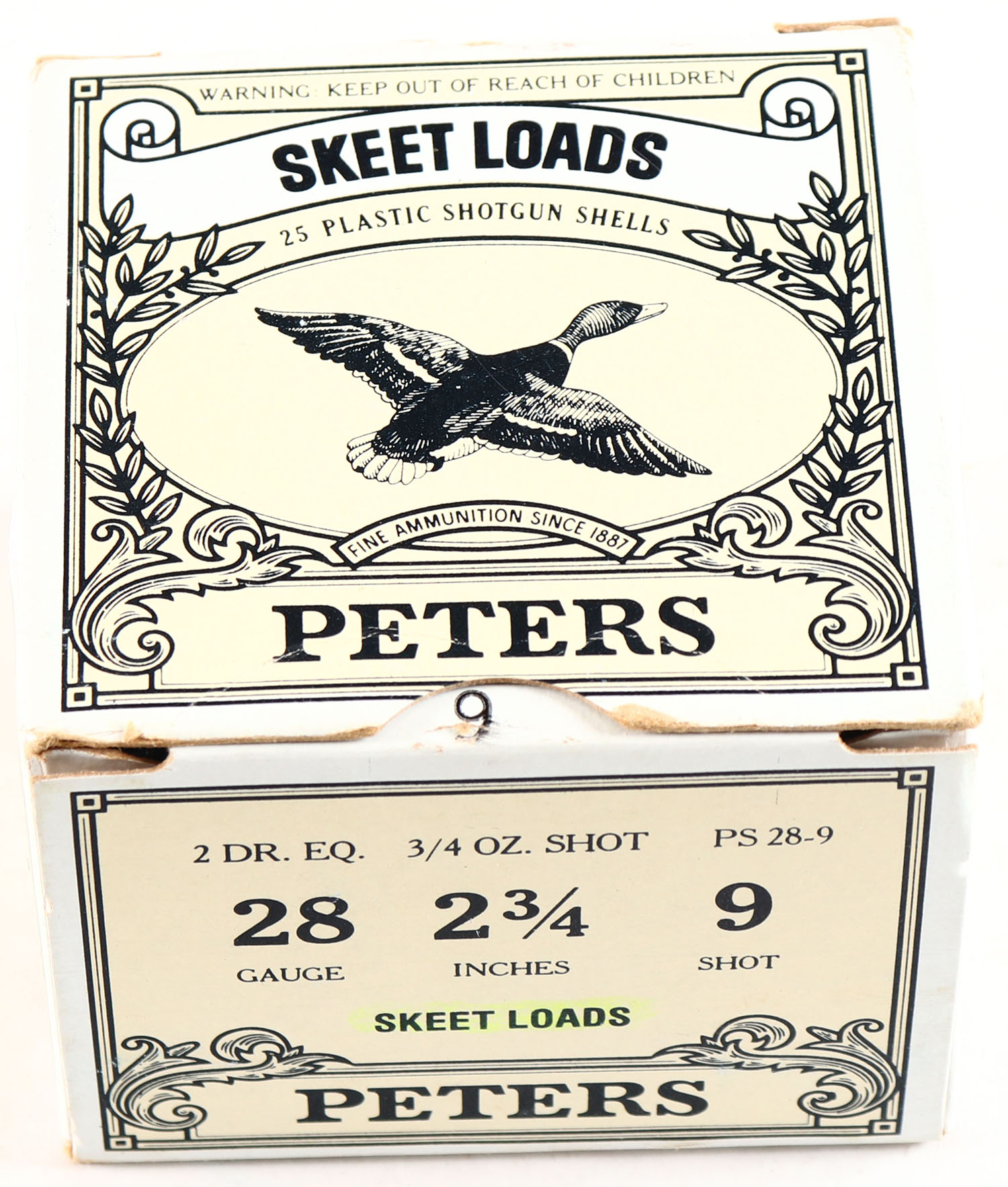 Peters Cart. Div., Skeet Loads, 28ga., 2 3/4'', 1pc., Full, shot size 9, multi colored box, box has great colors, shells are excellent. Grade: Excellent - Value: 10 to 40