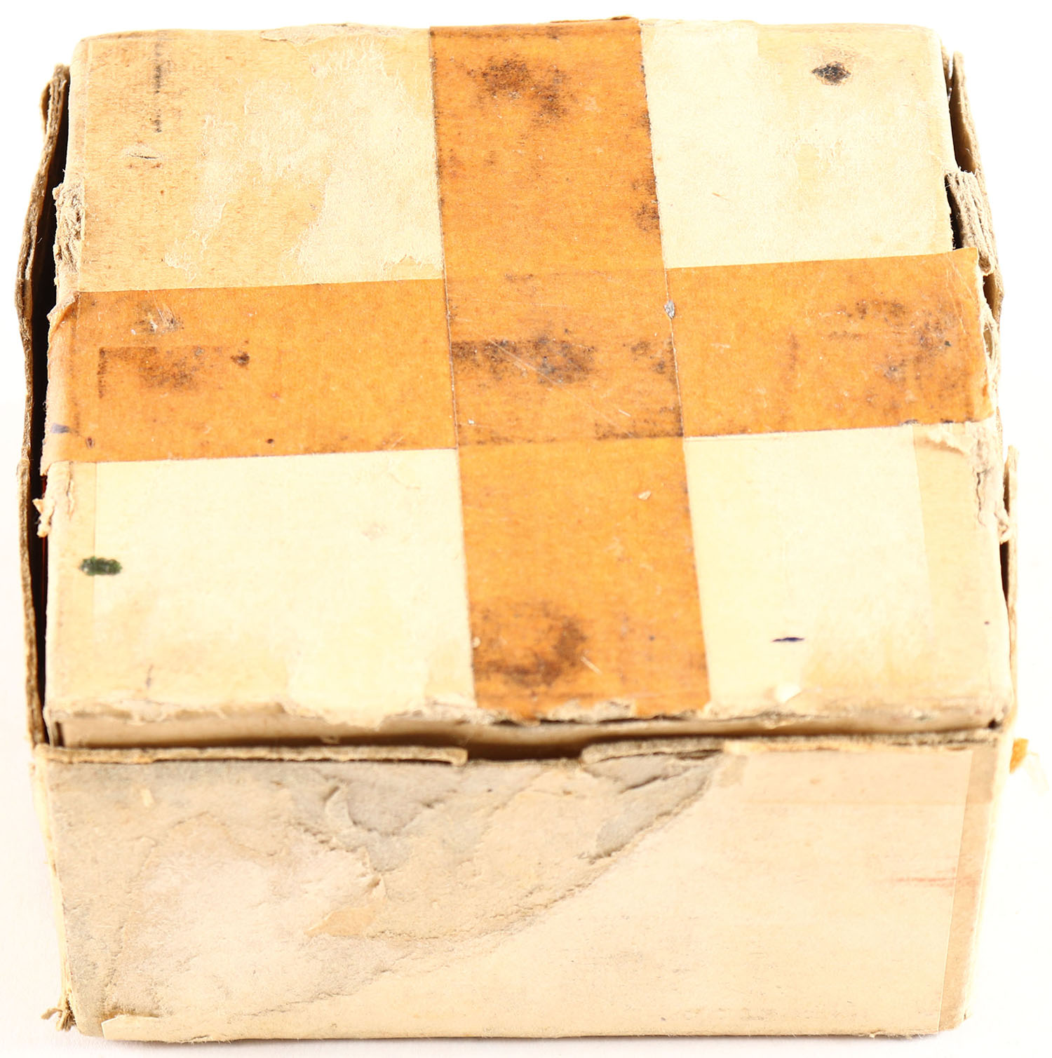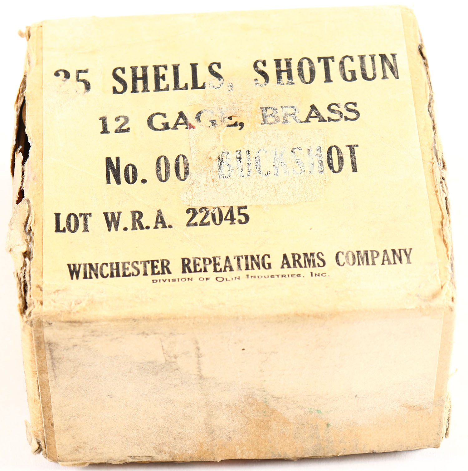 Winchester, Brass Shot Shells, 12ga., 2pc., 2 3/8'', Full, shot size 00 Buckshot, buff box with black colored end label, box has soiling & scuffing, shells are excellent. Grade: Very Good - Value: 30 to 100