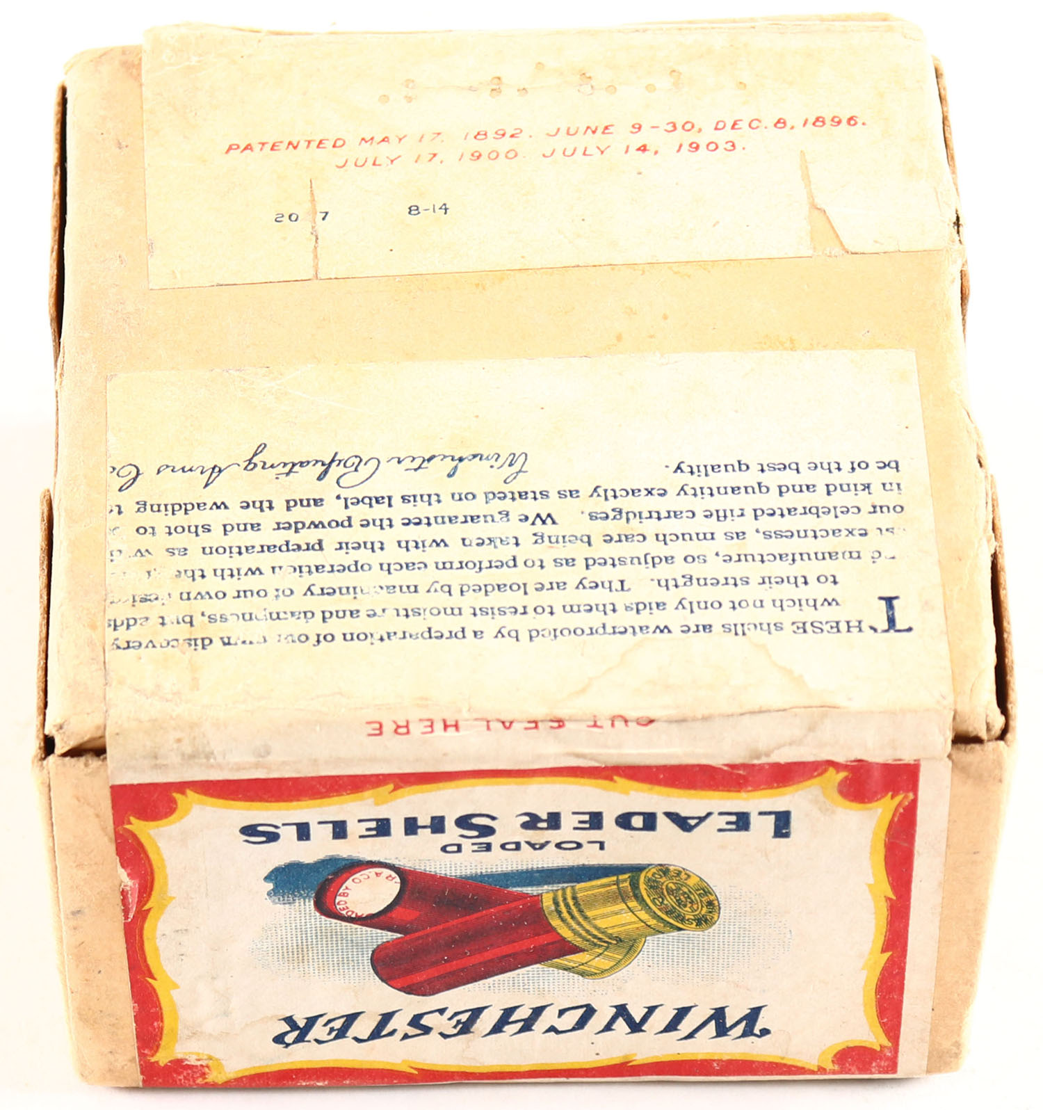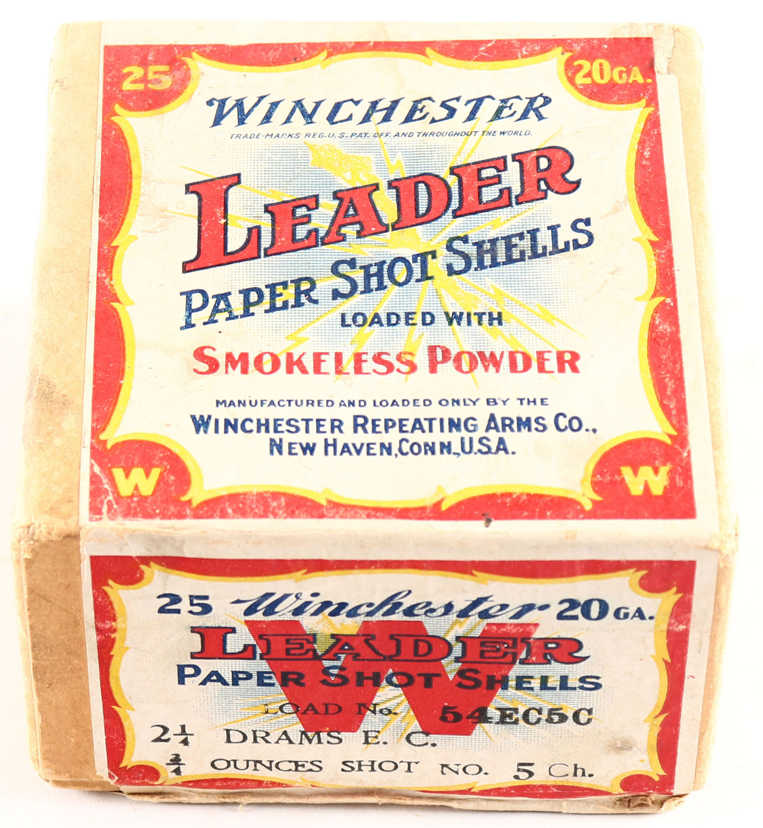 Winchester, LEADER, 20ga, 2pc., FULL & SEALED, shot size 5CH, Buff box with red, yellow, white & black label showing lightning bolt, box is very solid with great color to label, box has some age soiling & light scuffing. Grade: Excellent - Value: 200 to 600