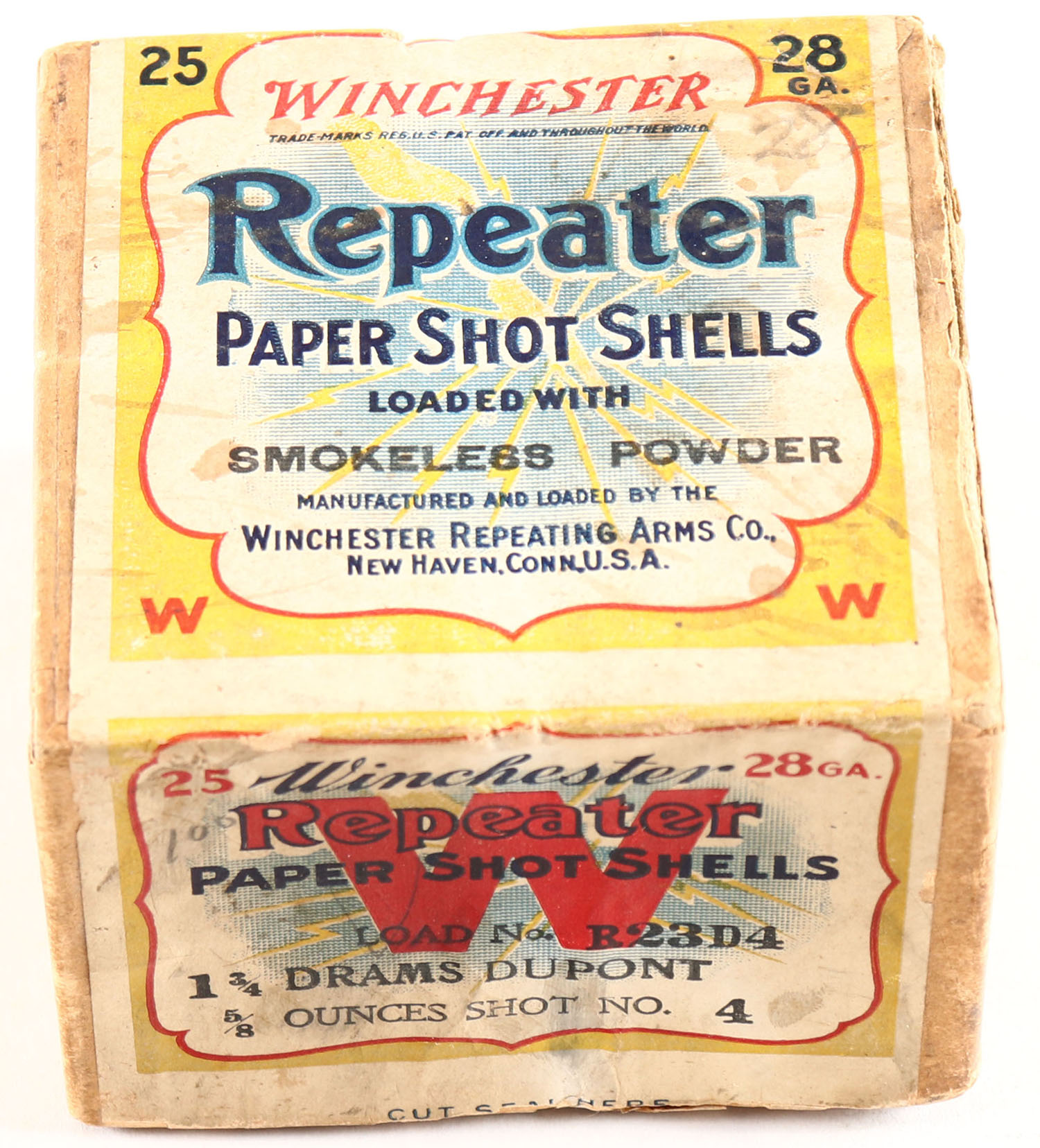 RARE Winchester, REPEATER, 28 Gauge, 2pc., Empty, Shot Size 4, Buff box with yellow, white & red label showing lightning bolt, box is solid with nice label, box has seam split with age soiling. Grade: Very Good - Value: 100 to 400