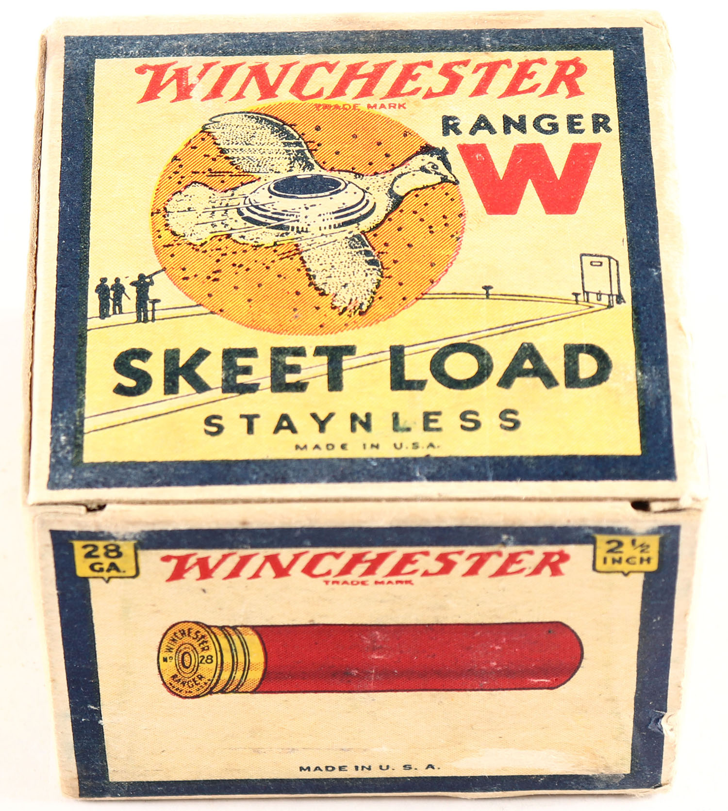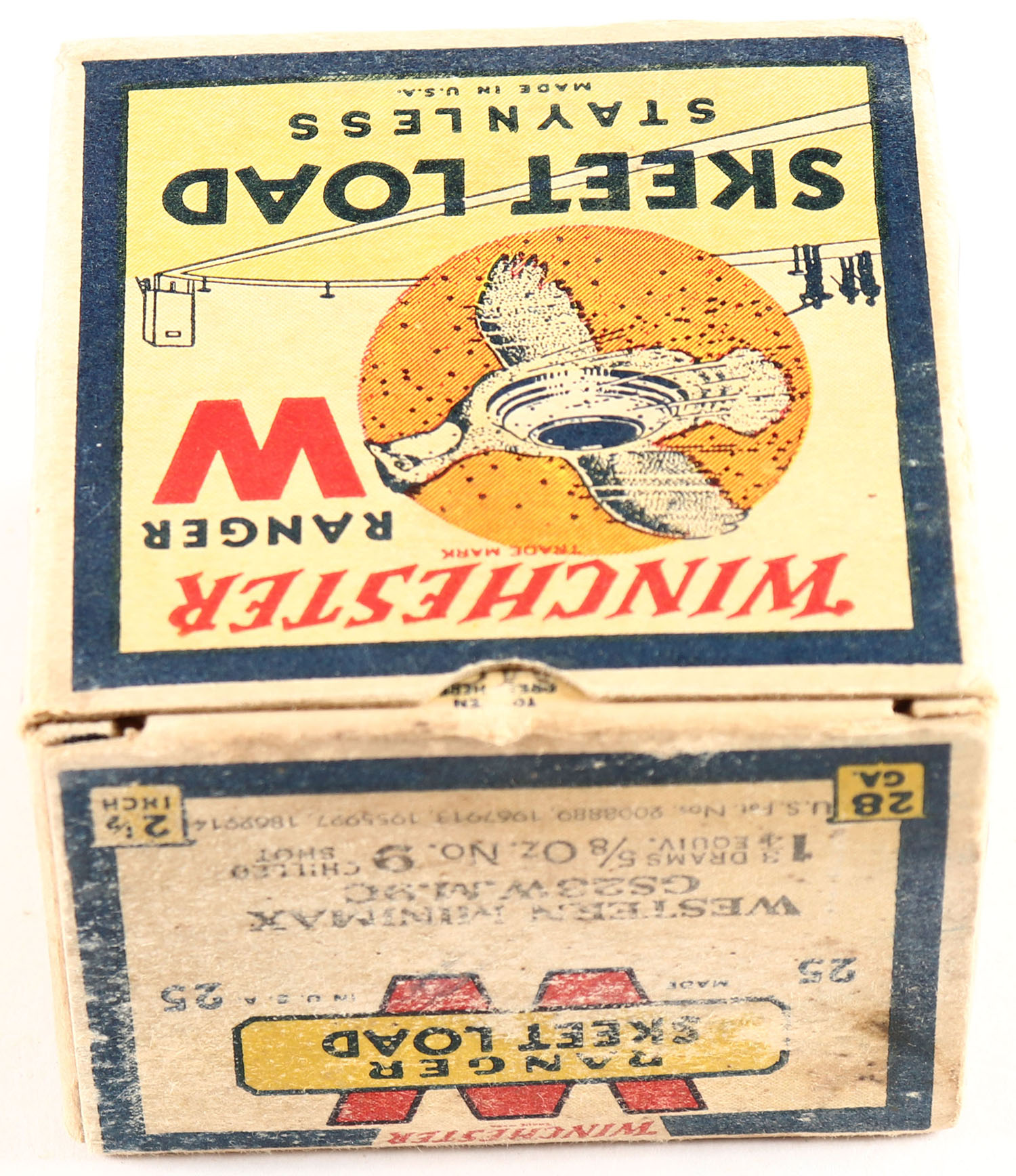 Winchester, RANGER SKEET LOAD, 28ga, 1pc., Full, White, black & red box that pictures flying Quail with skeet in body & shot all around, Staynless, 2 1/2'', Loading: 1 3/4 Drams 5/8 Oz. 9 Chilled Shot, Box is very solid with light soiling & excellent colors, Shells are excellent. RARE BOX. Grade: Excellent + - Value: 200 to 800