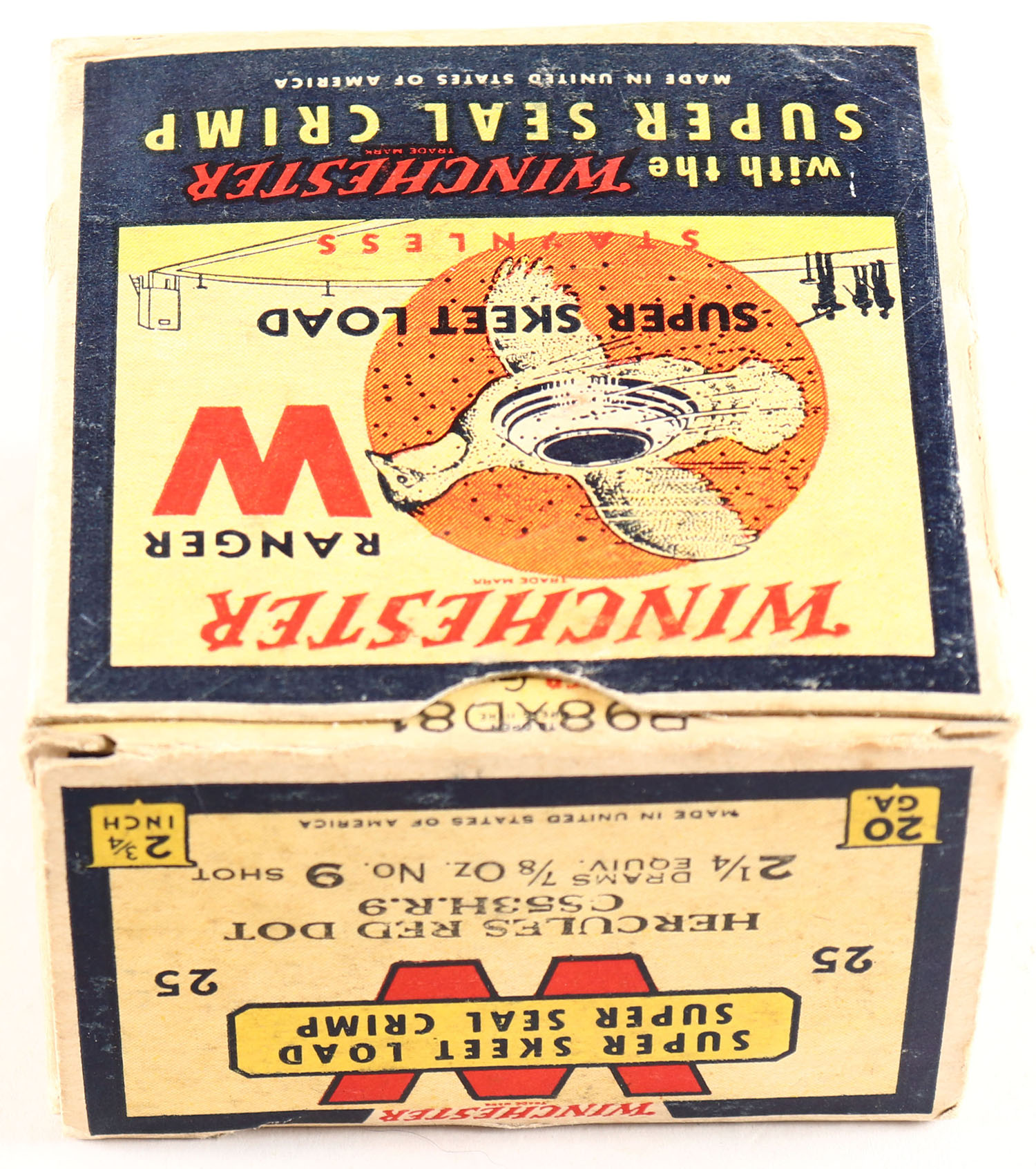 Winchester, RANGER SUPER SKEET LOAD, Hercules Red Dot, 20ga, 1pc., Full, White, blue & red box that pictures flying Quail with skeet in body & shot all around, Staynless, 2 3/4'', Loading: 2 1/4 Drams 7/8 Oz. 9 Shot, Box is solid with excellent colors, RARE BOX Shells are very good. Grade: Excellent ++ - Value: 100 to 300