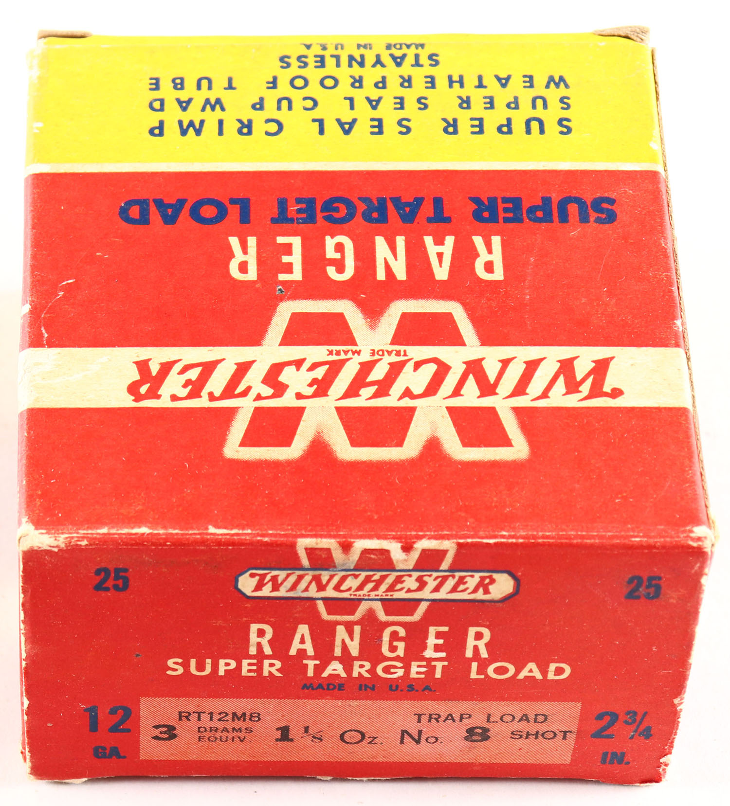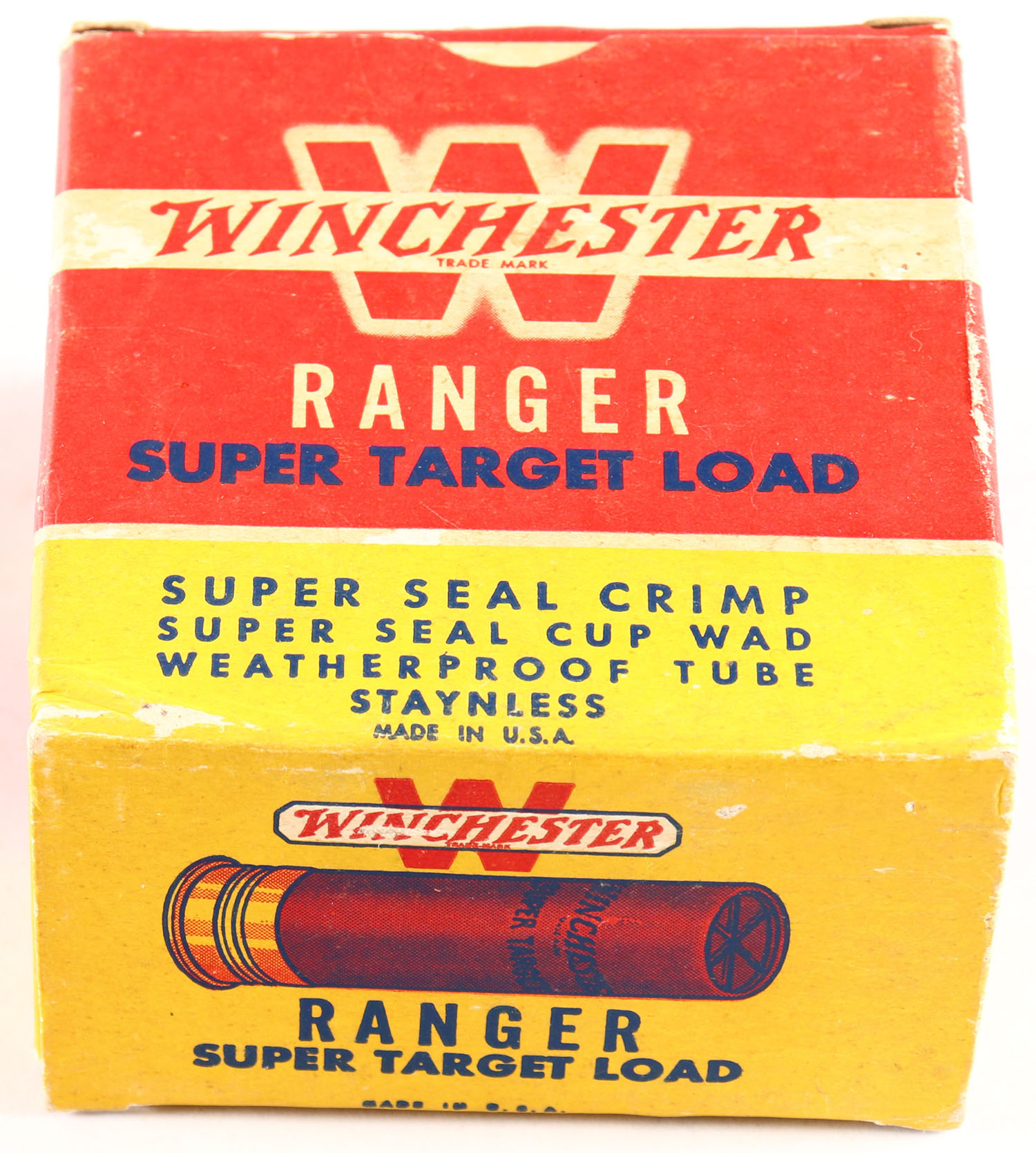 Winchester, Ranger Super Target Load, 12ga., 1pc., Full, shot size 8, red, white & yellow box, Box is very solid with very nice colors, shells are excellent. Grade: Excellent + - Value: 10 to 30