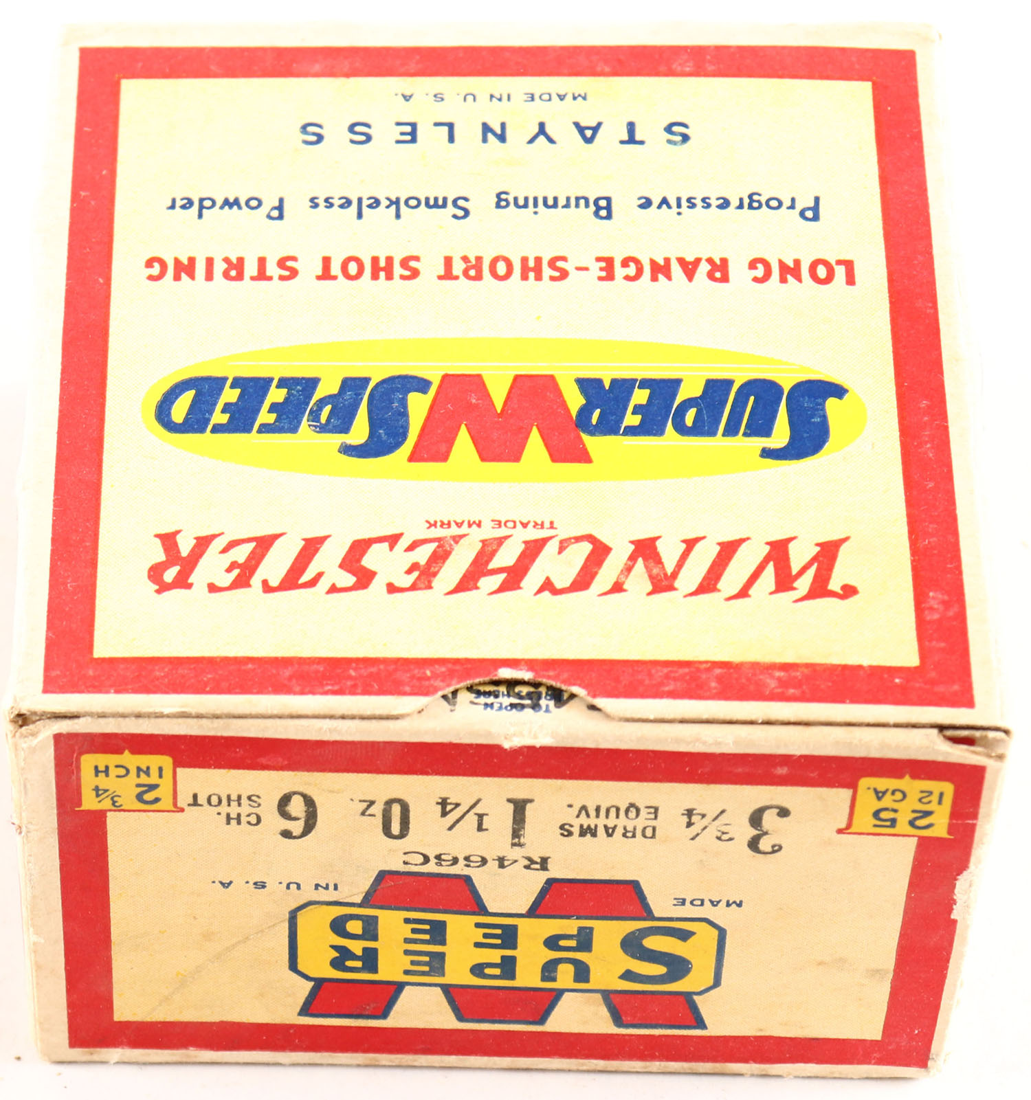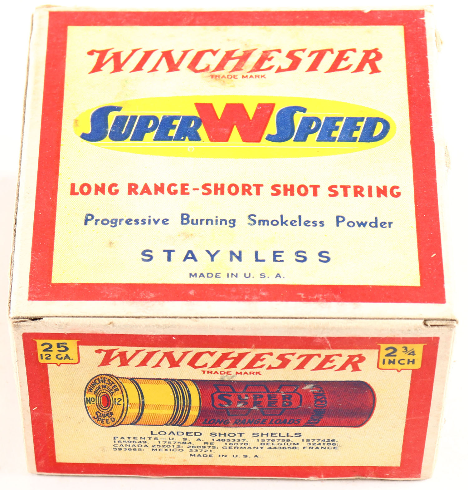 Winchester, Super W Speed, 12ga., Staynless, 2 3/4 in., 1pc., Full, shot size 6Ch., cream red, blue and yellow box, box is very solid with great colors, shells are excellent. Grade: Excellent ++ - Value: 16 to 30