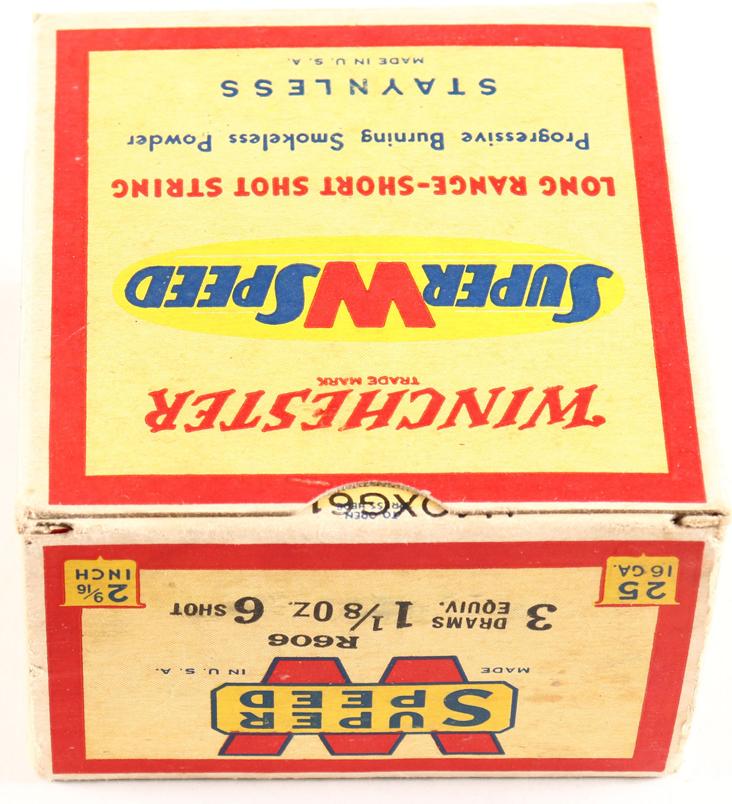 Winchester, Super W Speed, 16ga., Staynless, 2 9/16 in., 1pc., Full, shot size 6, cream red, blue and yellow box, box is very solid with great colors, shells are Minty. Grade: Excellent ++ - Value: 20 to 40