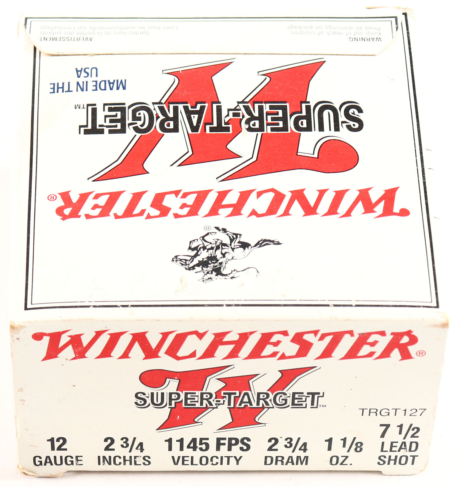 Winchester, Super Target, 12 ga., 1pc., Full, shot size 7 1/2 Lead, box is solid with great color, shells are excellent. Grade: Excellent ++ - Value: 10 to 40