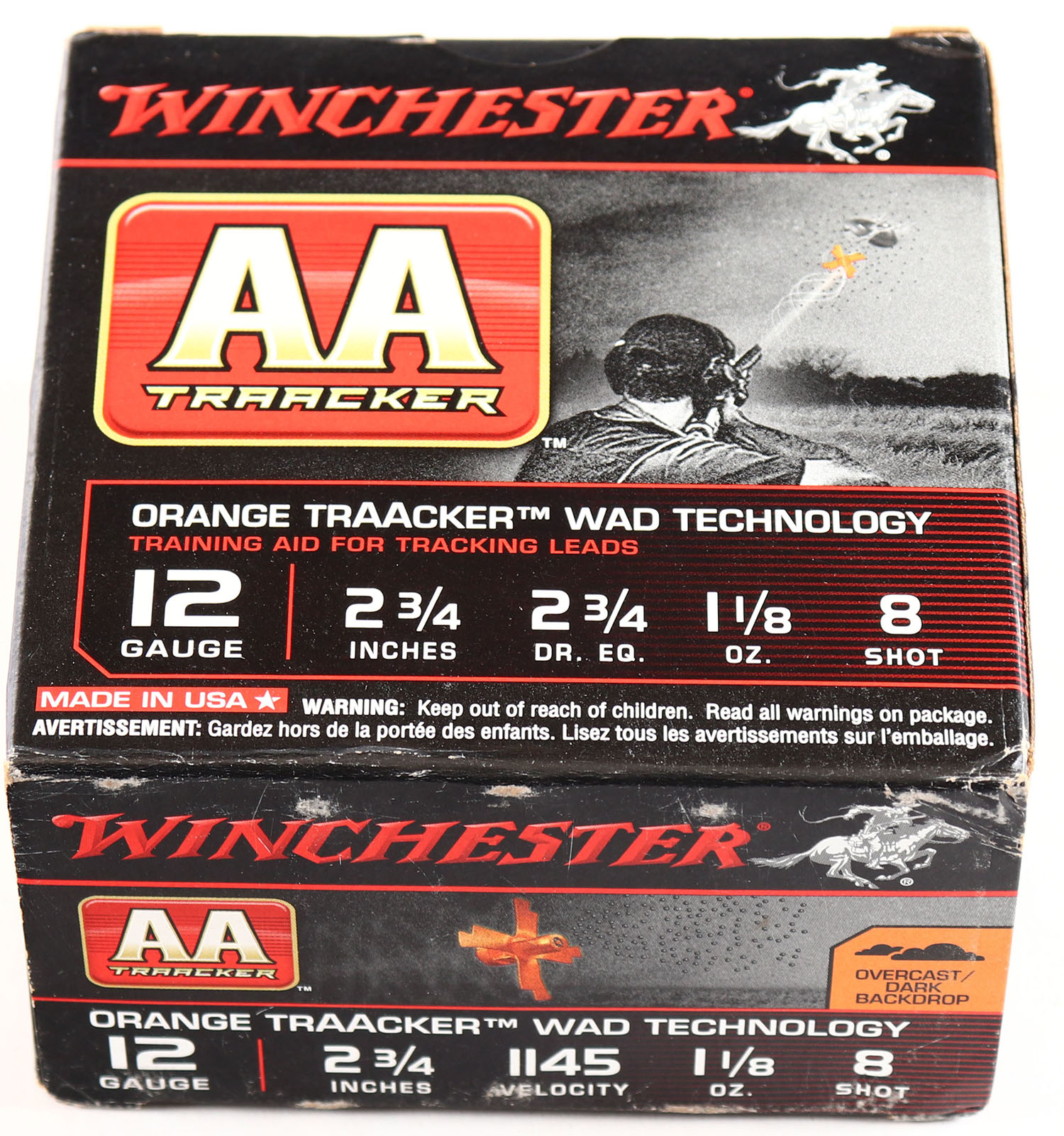 Winchester, AA, Tracker, 12ga., 2 3/4'', 1pc., Full, shot size 8, multi-colored box, box is very solid with great colors, shells are excellent. Grade: Excellent ++ - Value: 10 to 30