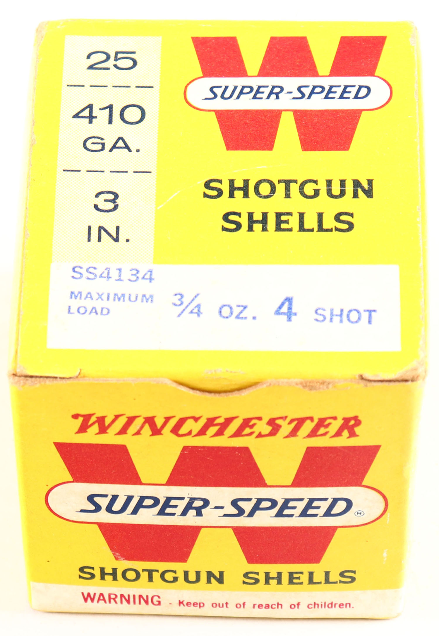 Winchester, Super Speed, 410ga., 1pc., Full., 2'', shot size 4, red, yellow & white box, box is very solid with great colors, shells are excellent. Grade: MINT - Value: 16 to 40