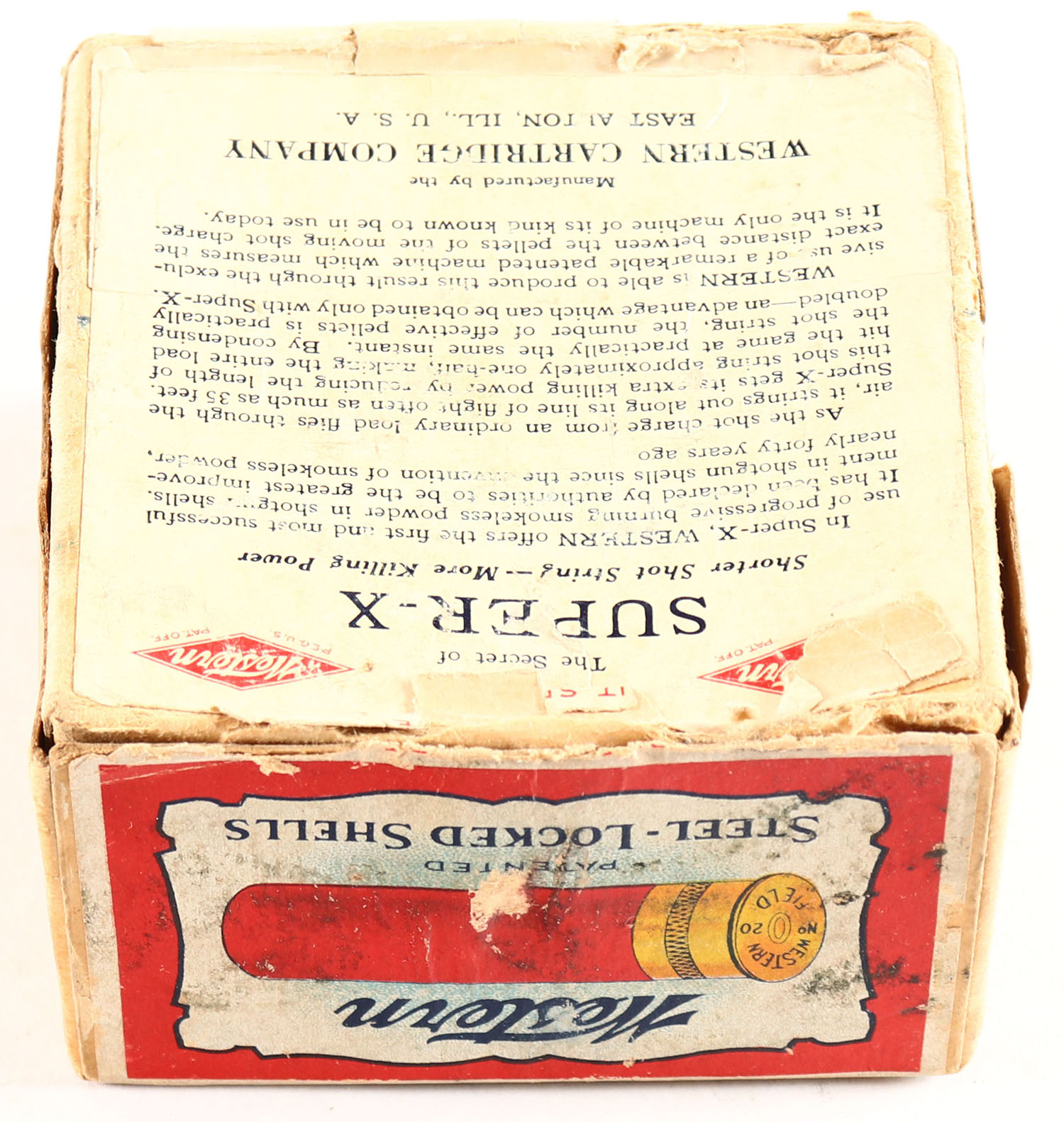 Western, Field/Super X, Label was made during transition from Field boxes to Super X boxes. 20ga., 2pc, Empty, shot size 5CH., box has scuffing & light edge wear with good label. Grade: Very Good + - Value: 40 to 140