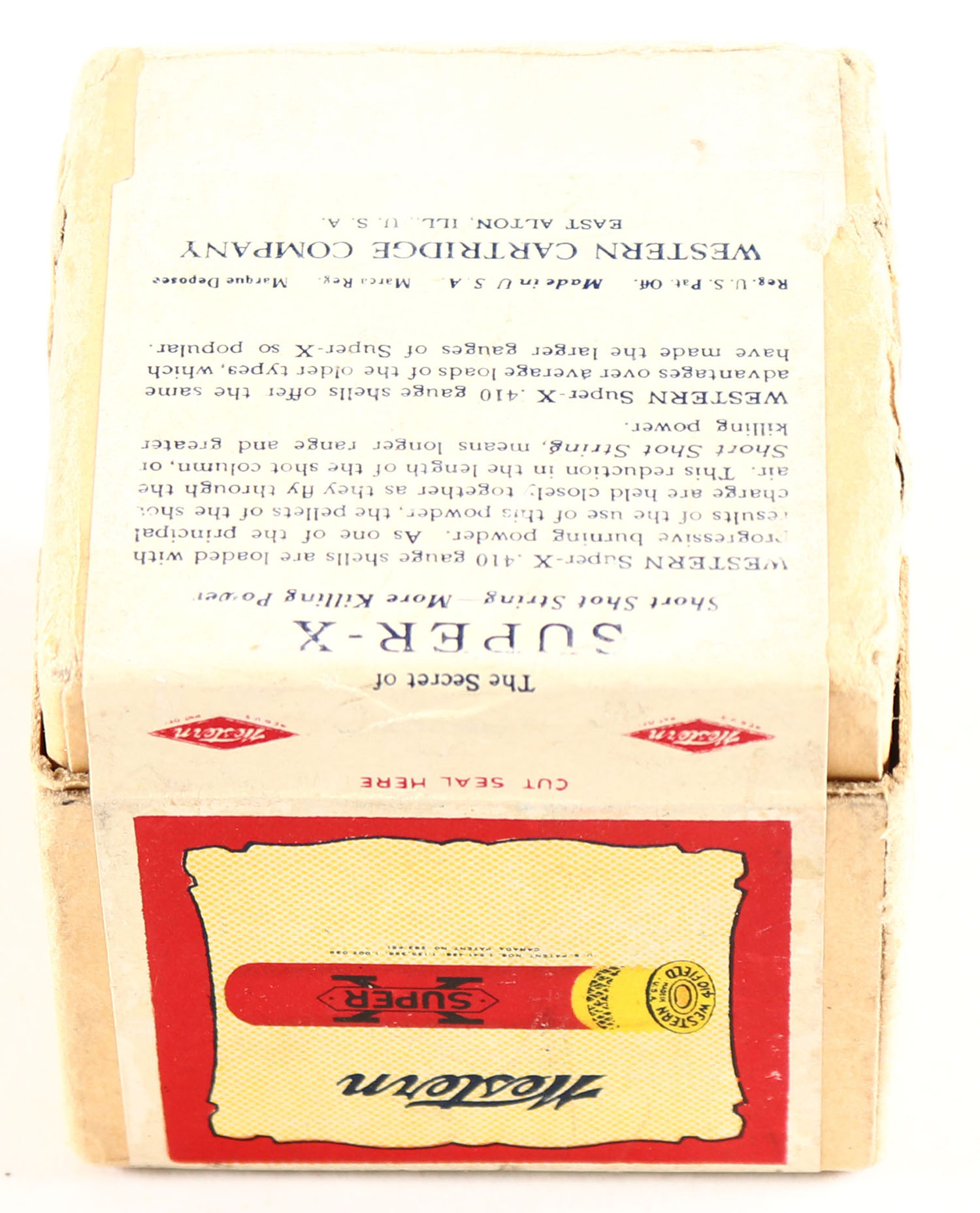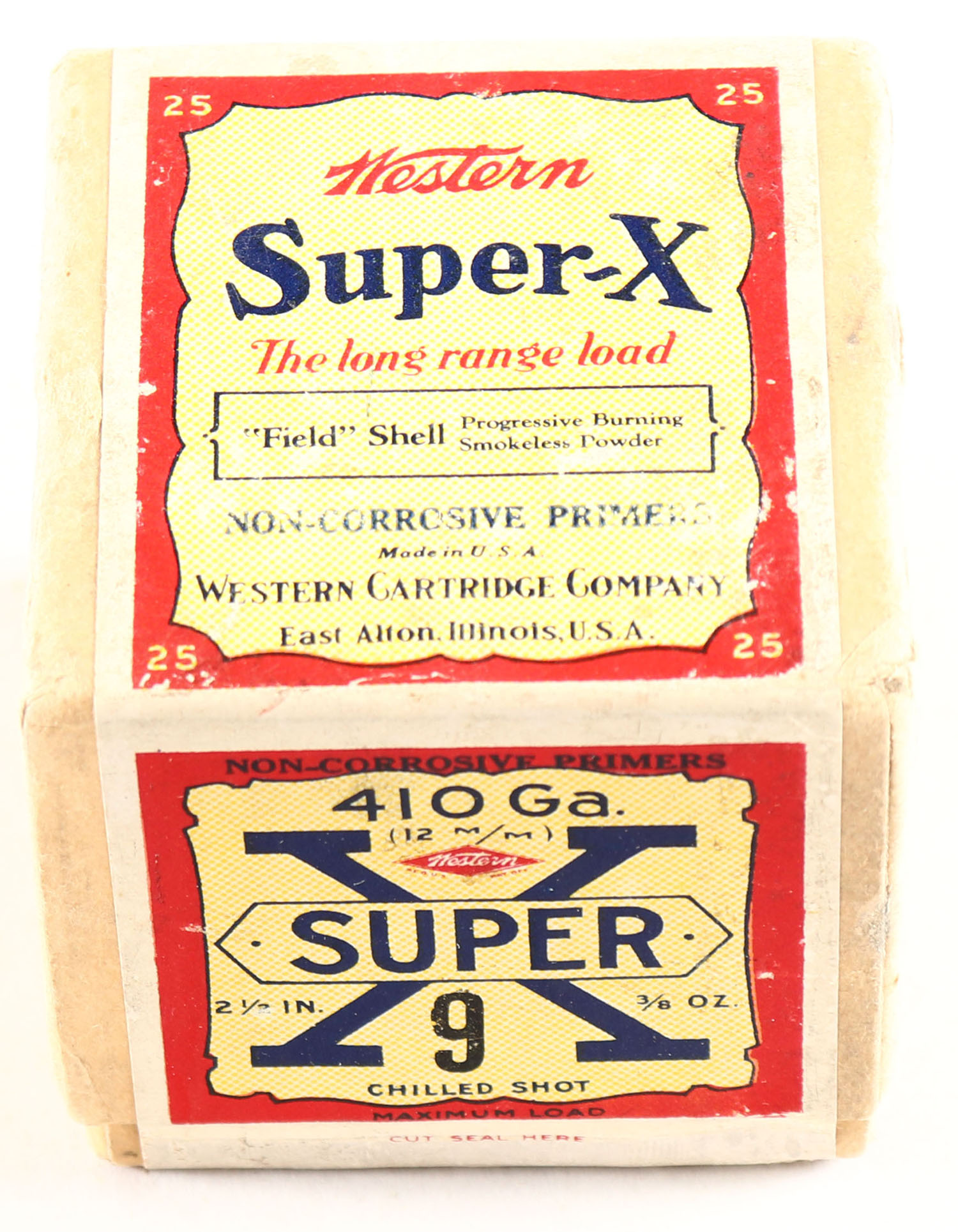 Western, Super-X, 410ga., 2pc, FULL & SEALED, shot size 9 Chilled Shot, box is solid with nice label, box has light scuffing. Grade: Excellent + - Value: 80 to 200