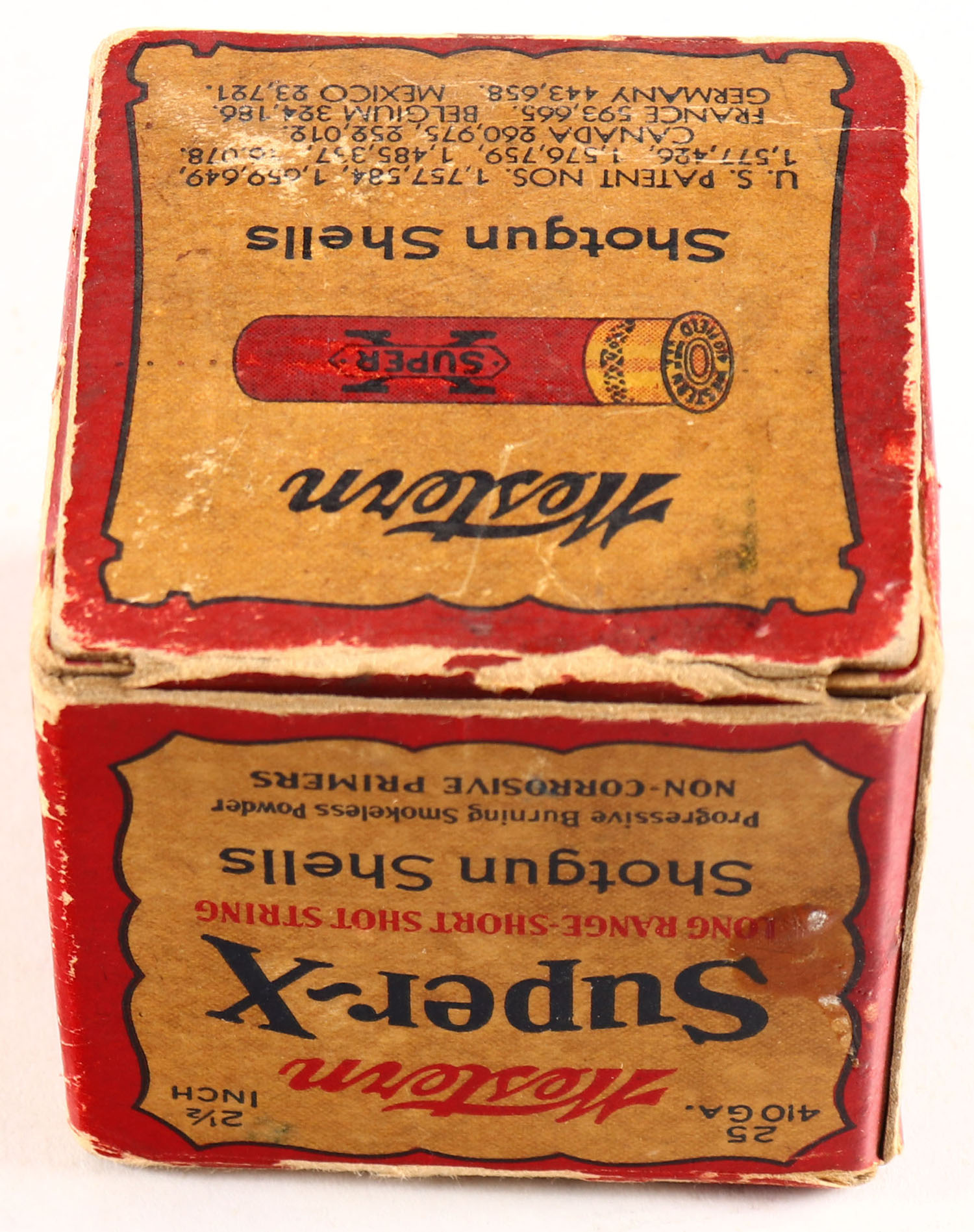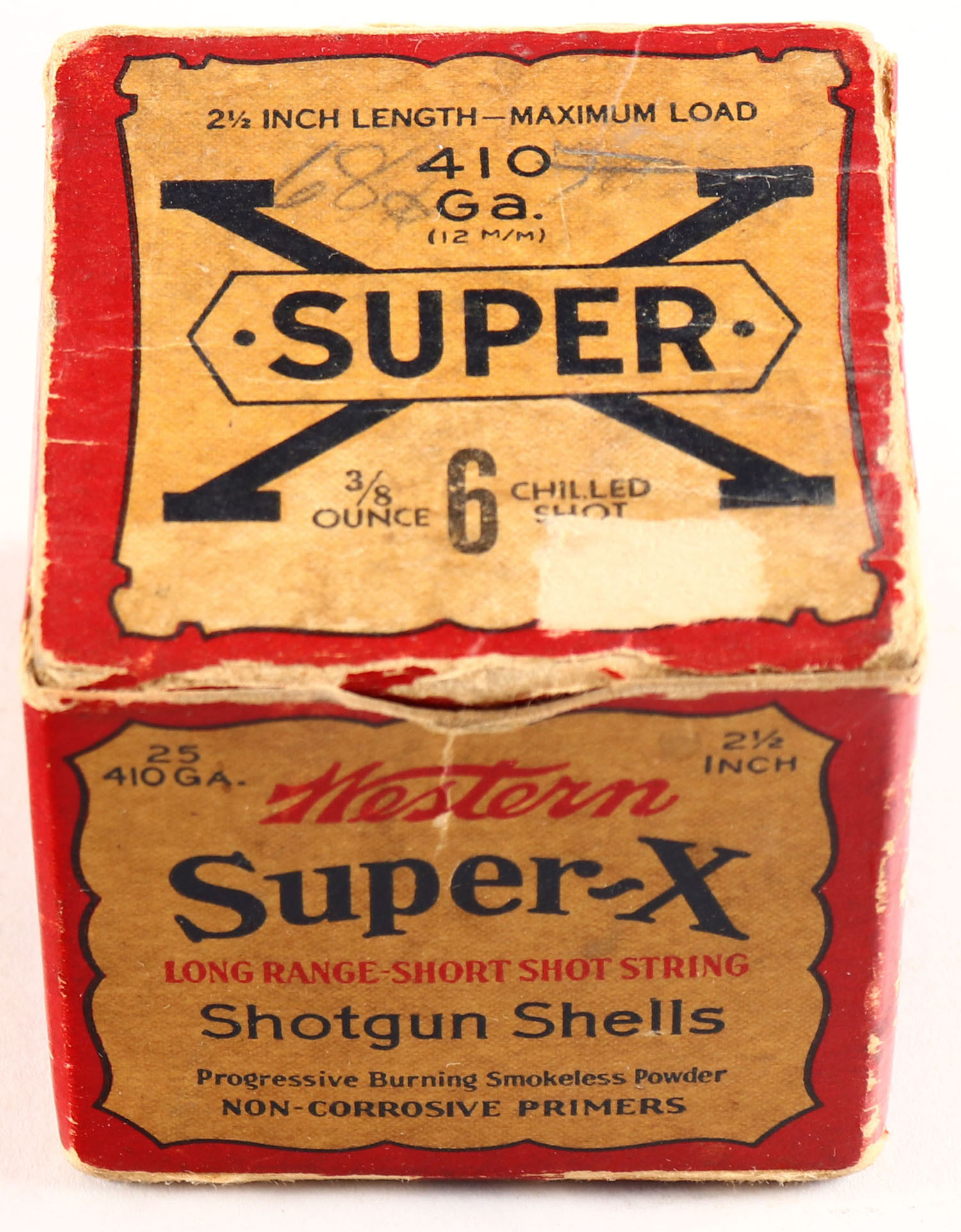 Western Cart. Co., Super X, 410ga., 2 1/2'' 1pc., Partial 12 rds., shot size 6 Chilled Shot, red, buff & black box, box has light scuffing & light edge wear, Shells are very good. Grade: Very Good - Value: 10 to 50