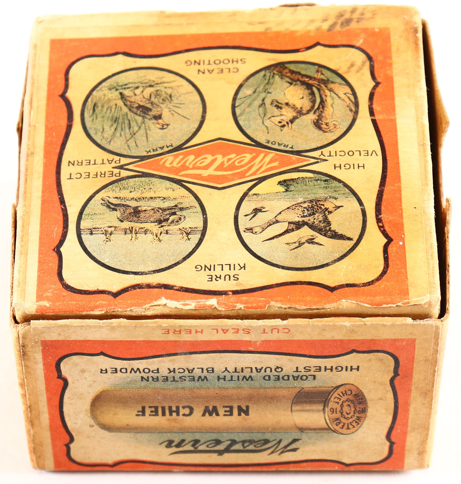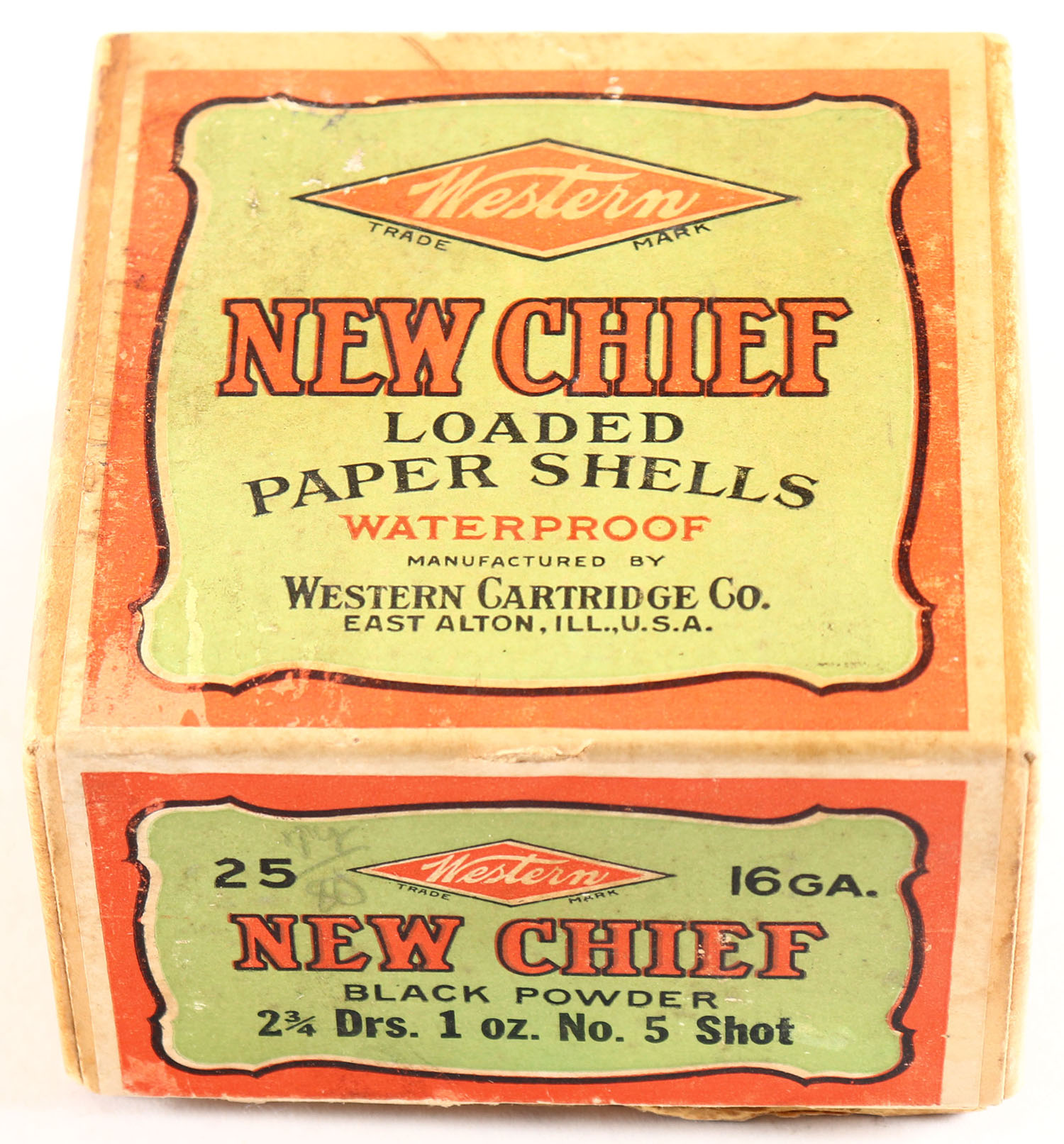 Western, NEW CHIEF, 16ga., 2pc., Empty, shot size Black Powder 2 3/4 Drs. 1 Oz. No. 5 Shot, buff box with green, red & black label, box is very solid with very nice colors, box has age soiling & scuffing, Western Diamond Logo on one side. Grade: Very Good + - Value: 40 to 100