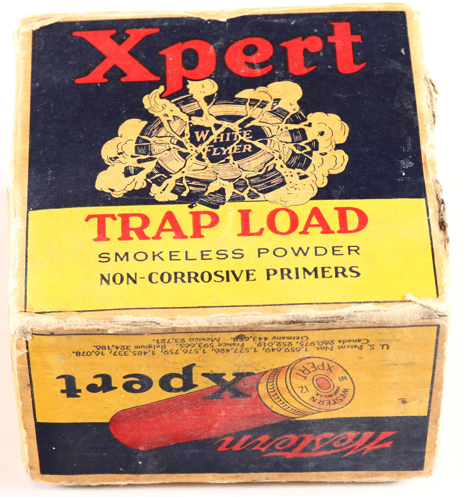 Western Xpert, TRAP LOAD, 12ga., 1pc., FULL, white, blue & red box that pictures White Flyer trap being broken, Loading: 3 Drams 1 1/4 Oz. No. 7 1/2CH, top inside flaps are torn, box is very solid with shell protrusions, edge wear, age soiling, and nice colors, shells are excellent. Grade: Very Good - Value: 100 to 300