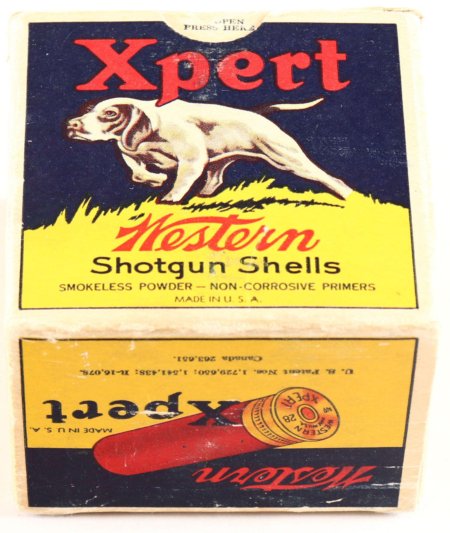 Western, Xpert, 28ga., 1pc., Full, blue, yellow & red box with a dog on point, No. 7 1/2 Chilled Shot, box has insert, box is very solid with great colors, Shells are excellent. Grade: Excellent ++ - Value: 200 to 600