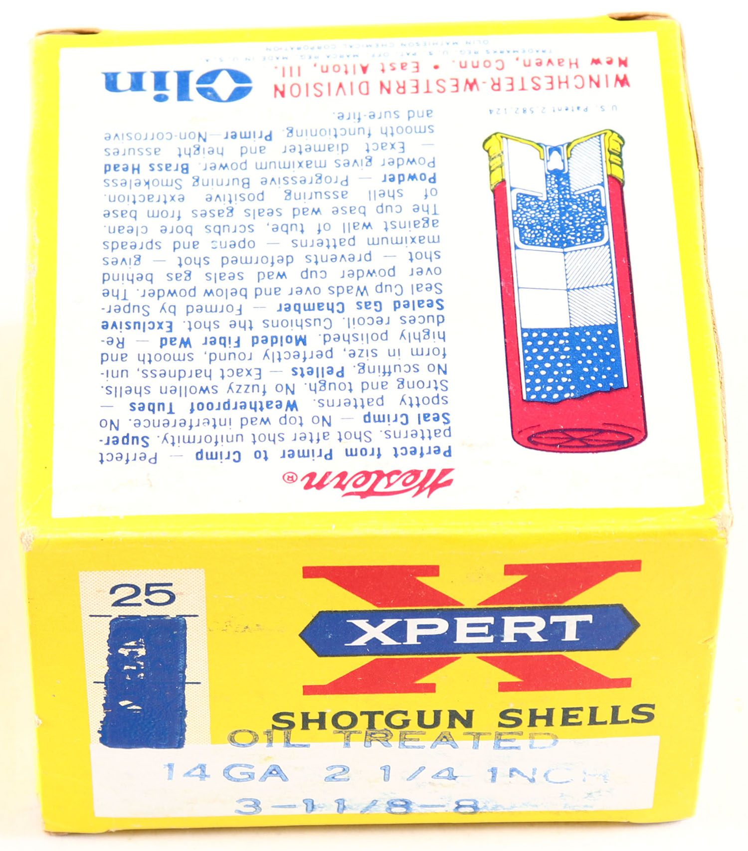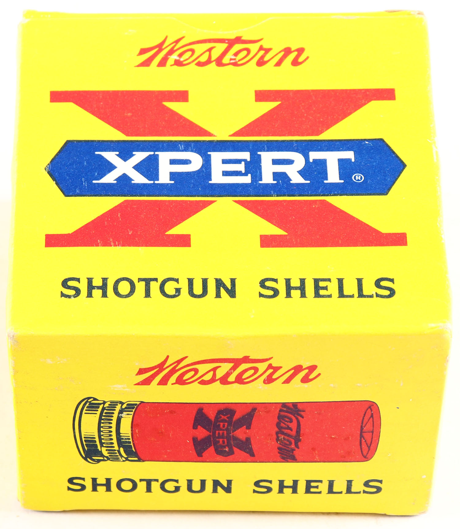 Western, Super X, RARE 14ga., 2 1/4'', 1pc., Full, Oil Treated, shot size 8, yellow, blue & red box, box is very solid, box has great colors, shells are Minty. Grade: MINT - Value: 80 to 160