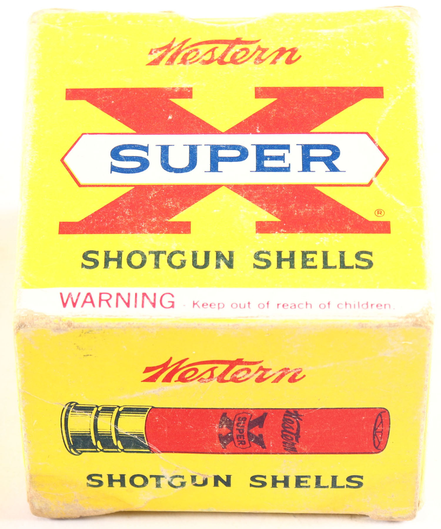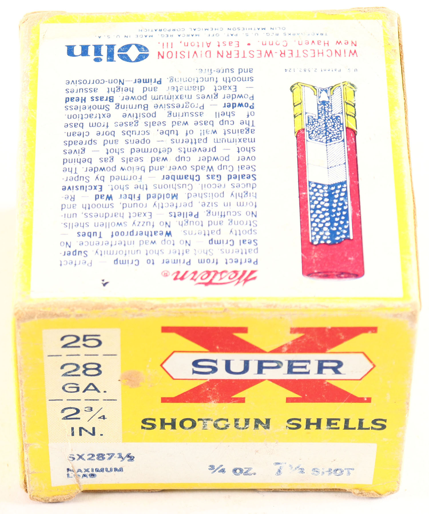 Western, Super X, 28ga., 2 3/4'', 1pc., Full, shot size 7 1/2, yellow, blue & red box, box is solid with light age soiling, box has great colors, shells are excellent. Grade: Excellent + - Value: 10 to 30