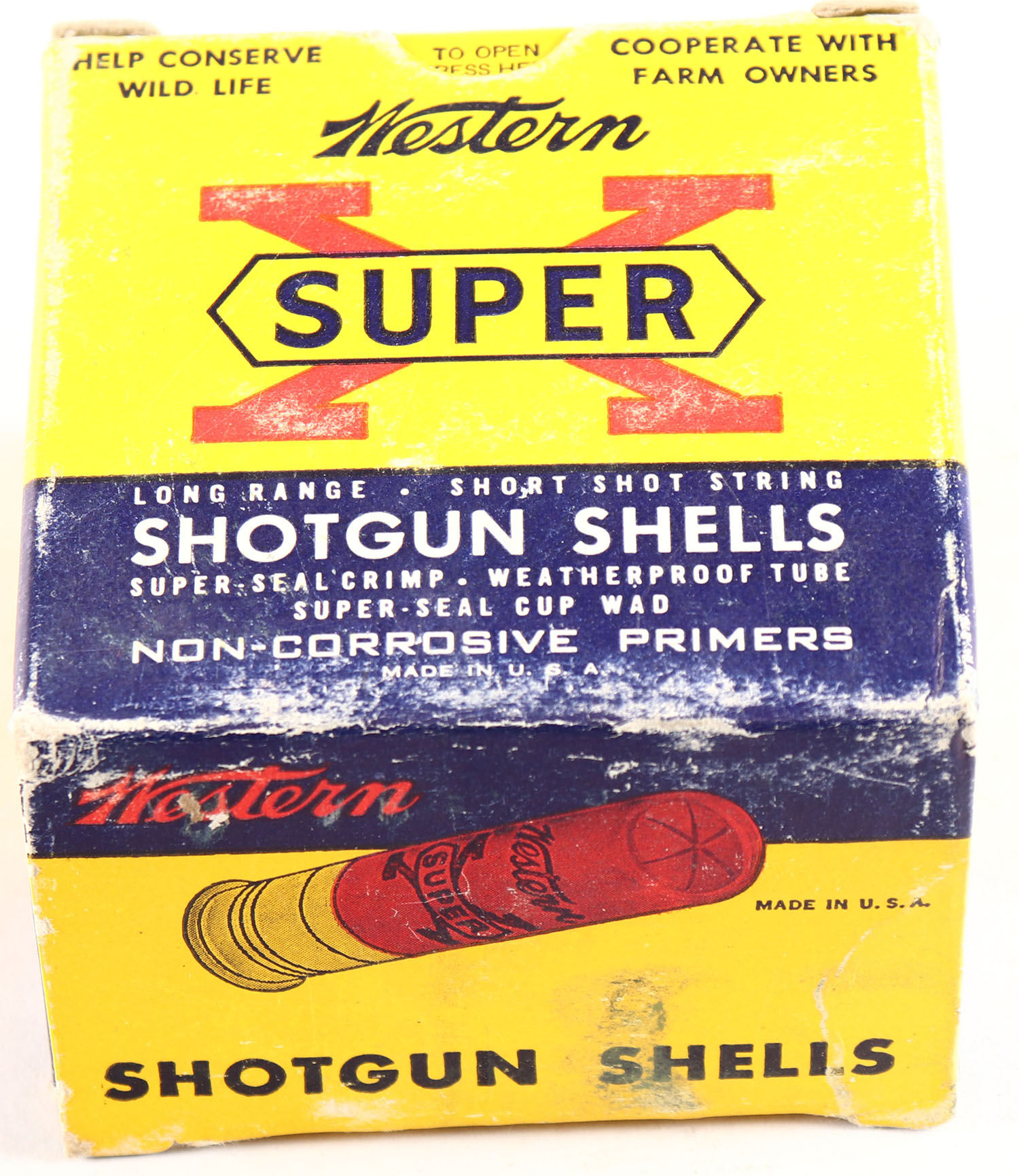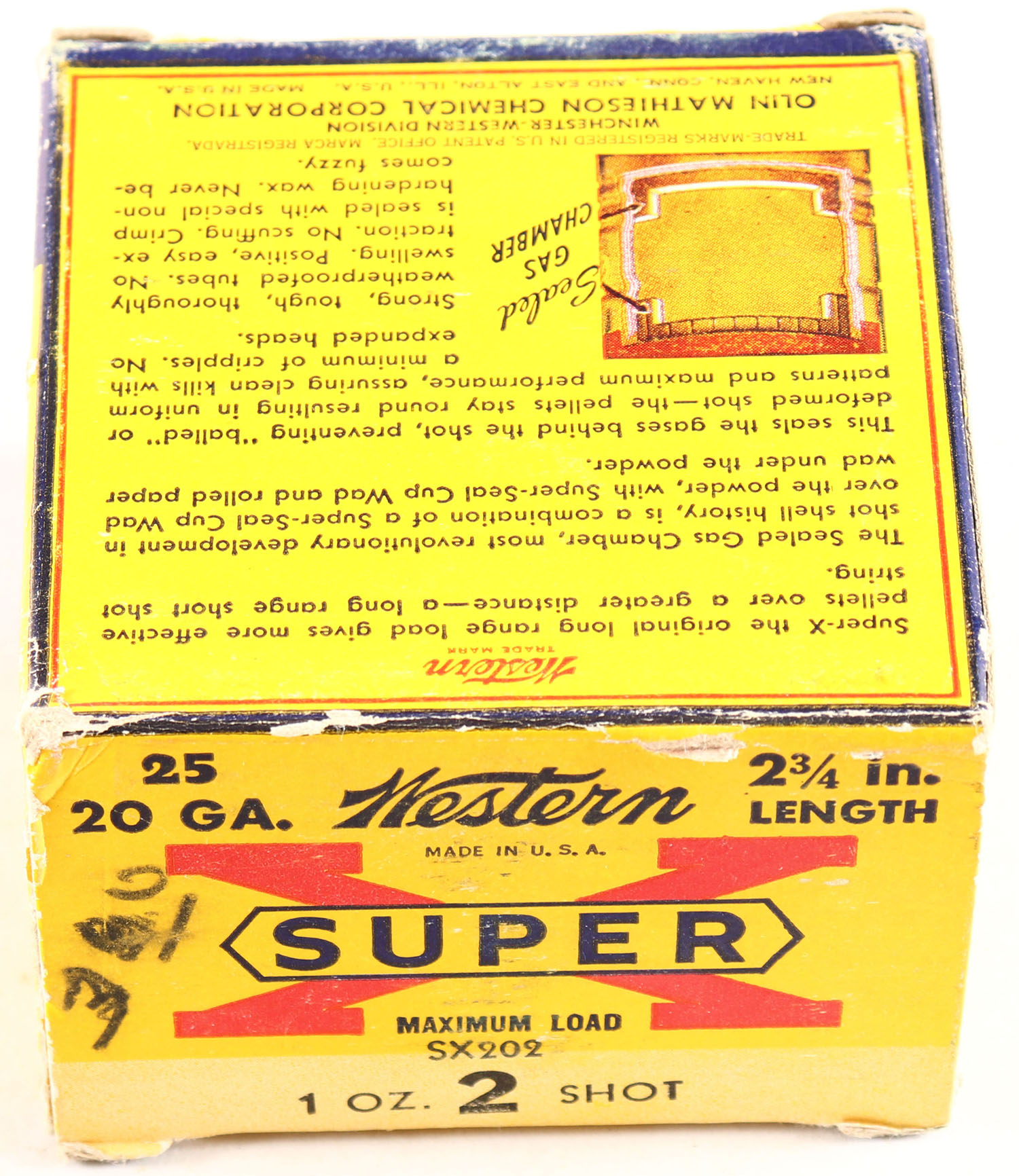 Western, Super X, 20ga., 2 3/4'', 1pc., Full, shot size 2, multi-colored box, box has tear & light scuffing, box has great colors, shells are excellent. Grade: Very Good ++ - Value: 10 to 30