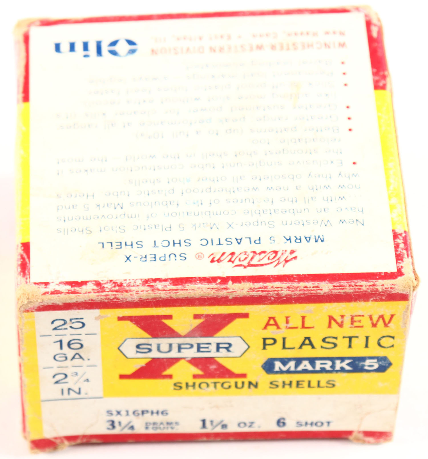 Western, Super X, Mark 5, 16ga., 2 3/4'', 1pc., Full, shot size 6, multi-colored box, box is solid with light age scuffing & light edge wear, box has very nice colors, shells are very good. Grade: Very Good + - Value: 10 to 30