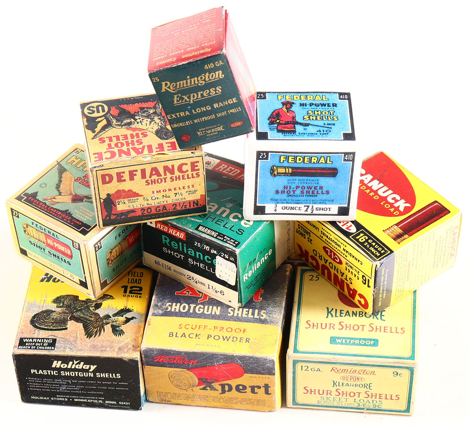 Full Lot of 12, Replicas of shot shell boxes, multi-colored boxes, boxes are very solid with great color. Grade: Excellent ++ - Value: 50 to 100
