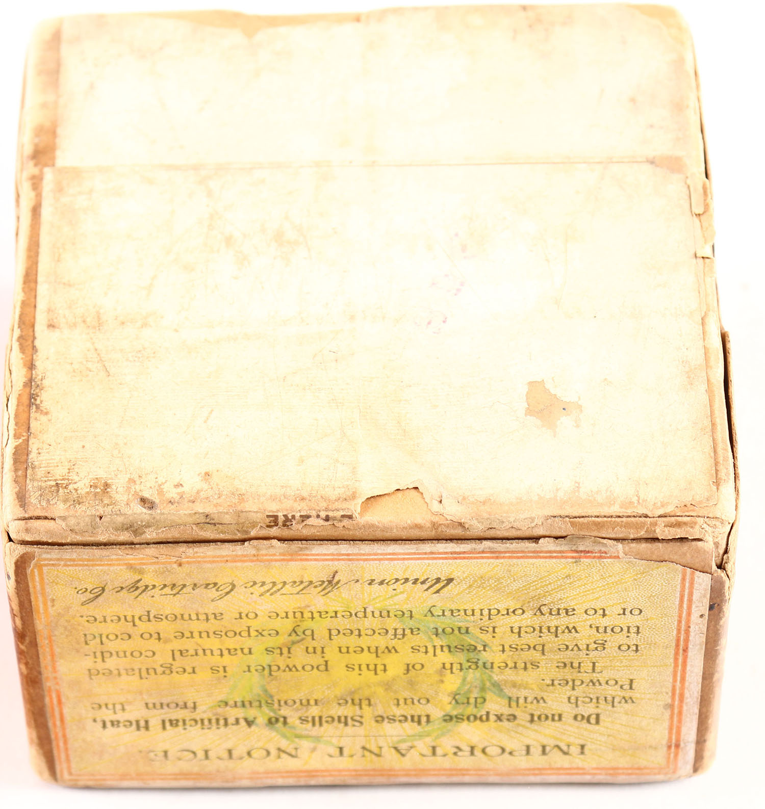 UMC, SMOKELESS, WALKING MAN SERIES, 12ga., 2pc., Empty, shot size 8 CH., buff box with multi colored label pictures hunter shooting from boat in center, Canvasback in bottom left hand corner & a Mallard in the bottom right, box is all original and solid, box has age soiling & light scuffing with wonderful colors, VERY HARD TO FIND BOX. Grade: Excellent - Value: 1000 to 4000