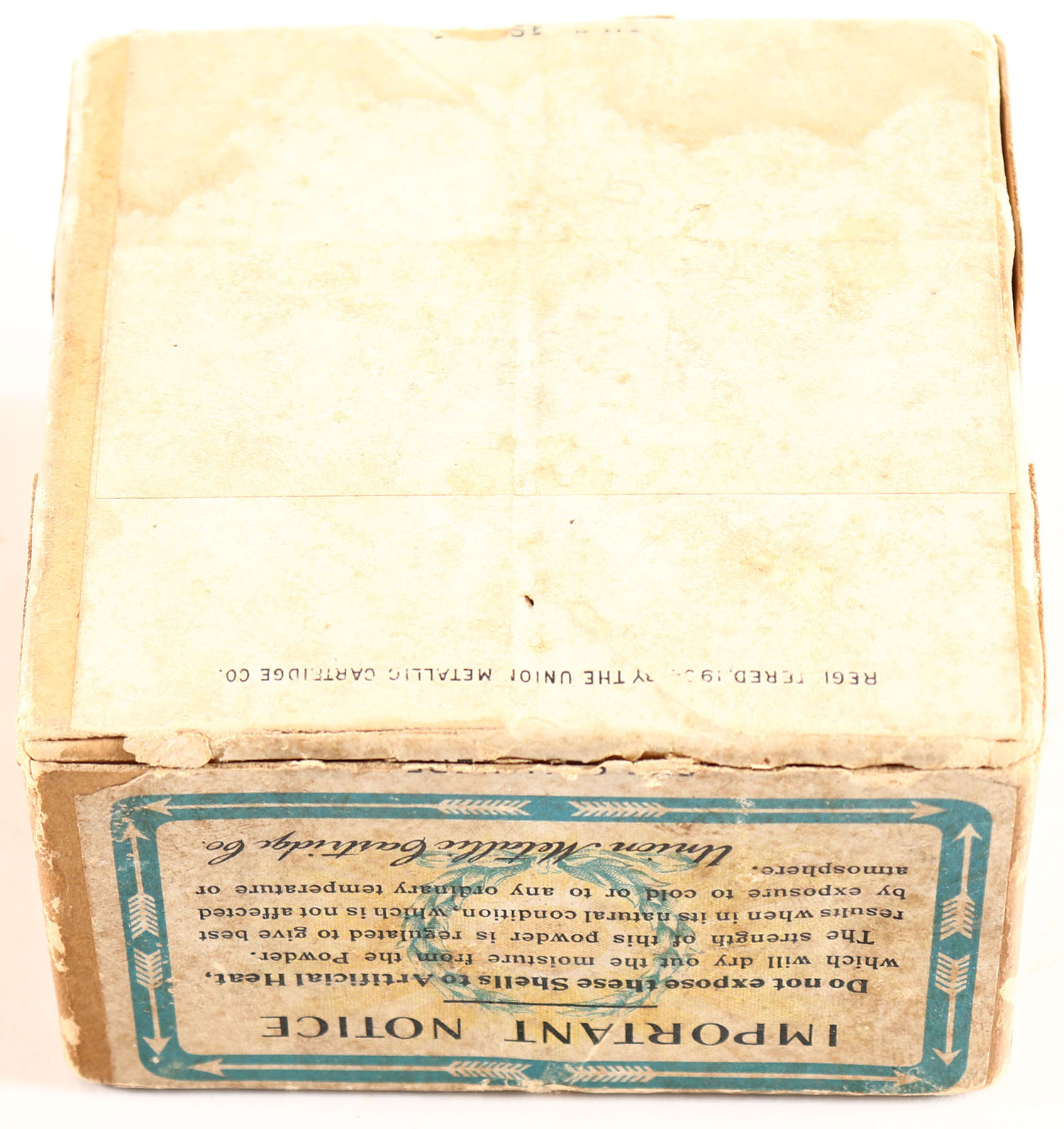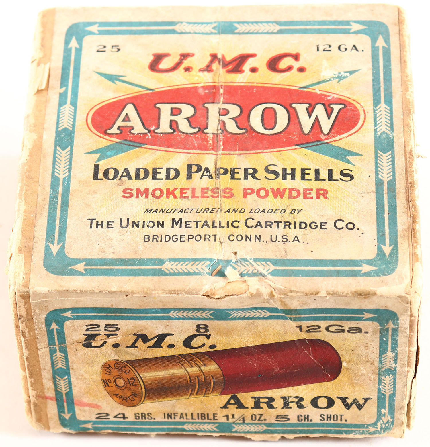 UMC, ARROW, 12ga., 2pc., Full, shot size 5CH, buff box with sunburst logo, box is very solid age soiling to label & edge wear, shells are excellent. Grade: Very Good ++ - Value: 60 to 200