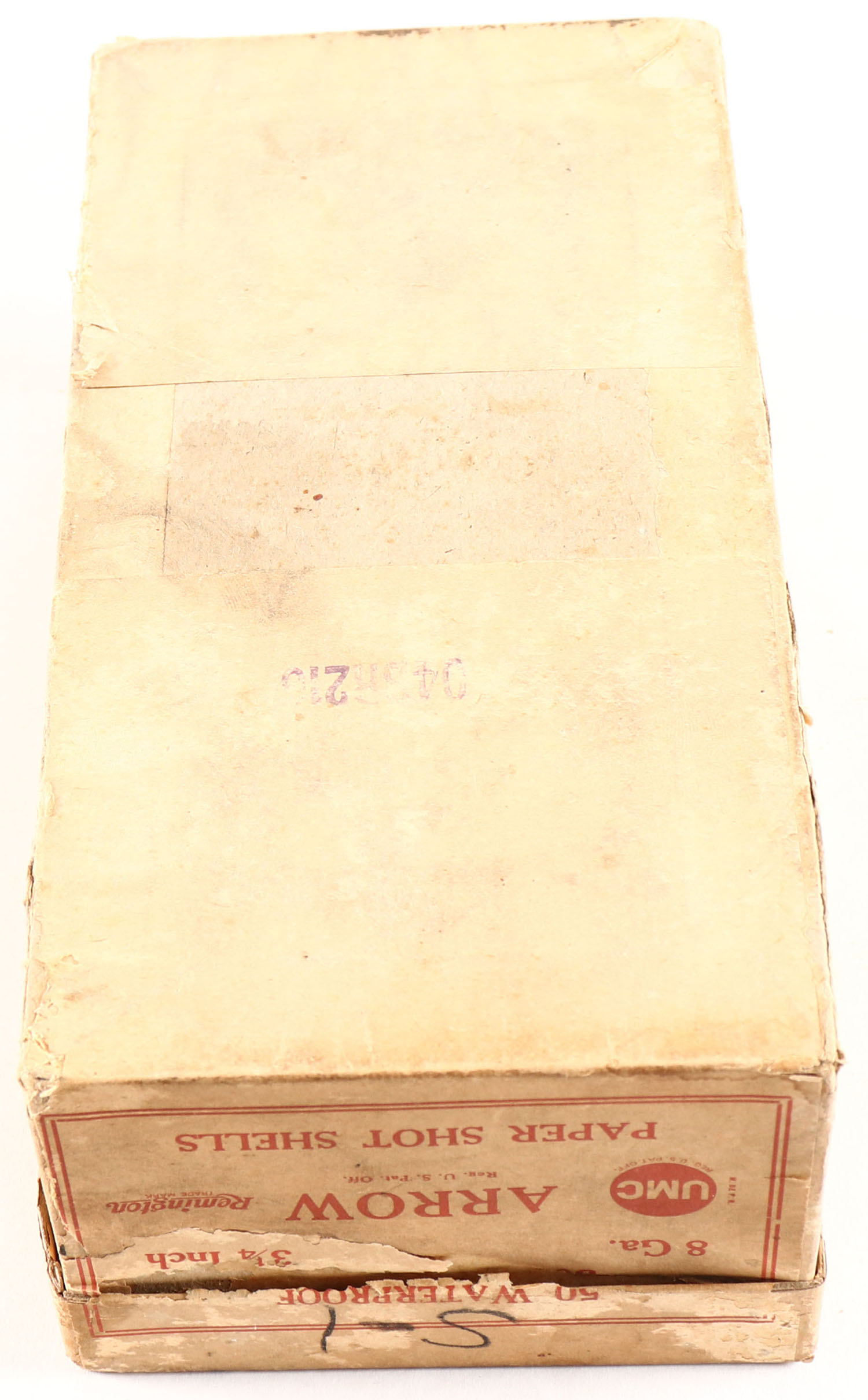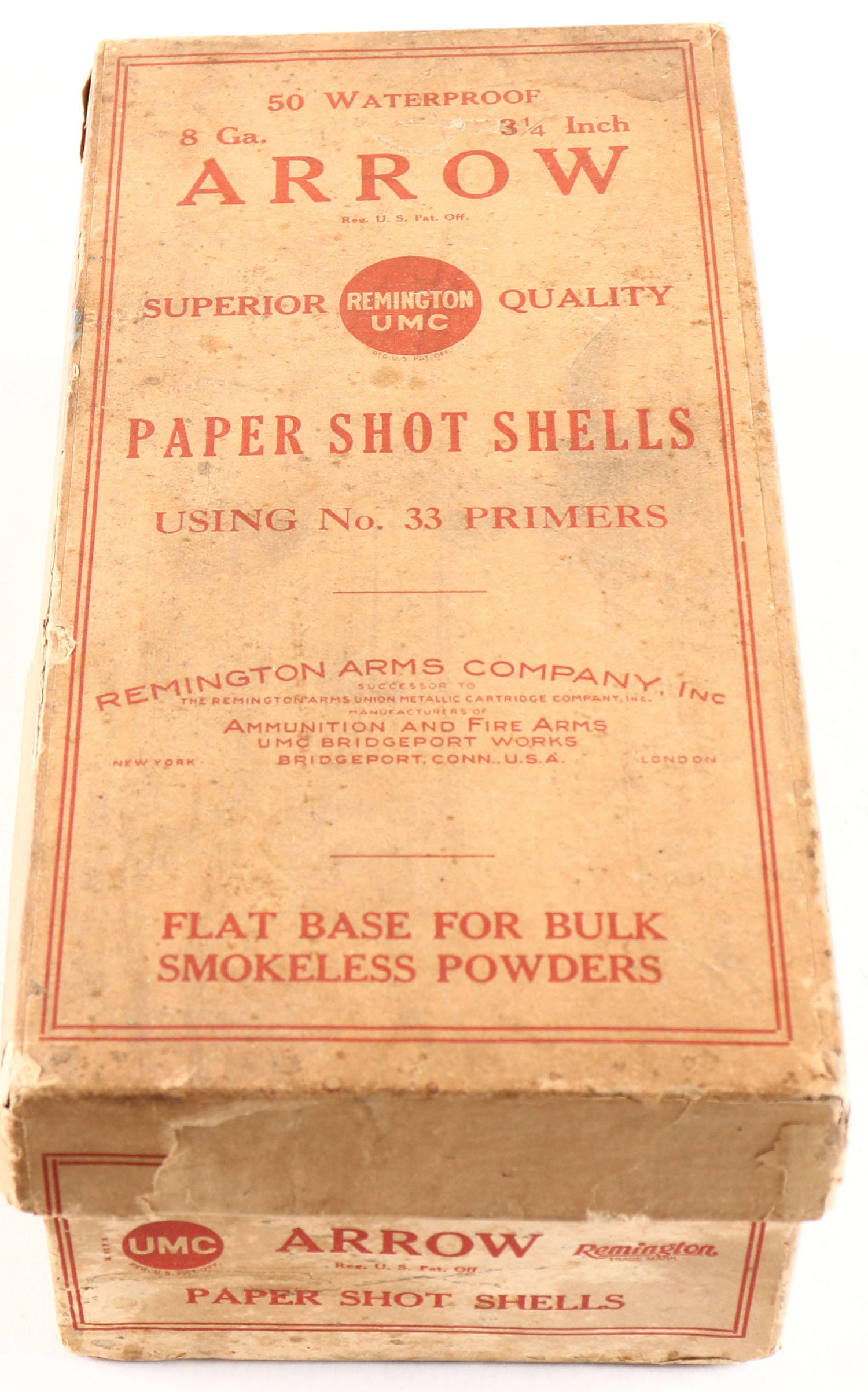 RARE SHOE BOX, Remington UMC, ARROW, 8ga., NPE, 2pc., Full, 3 1/4 Inch., buff box with buff & red label, box is solid with age soiling to label and some scuffing, shells are very good. Grade: Excellent + - Value: 1000 to 5000