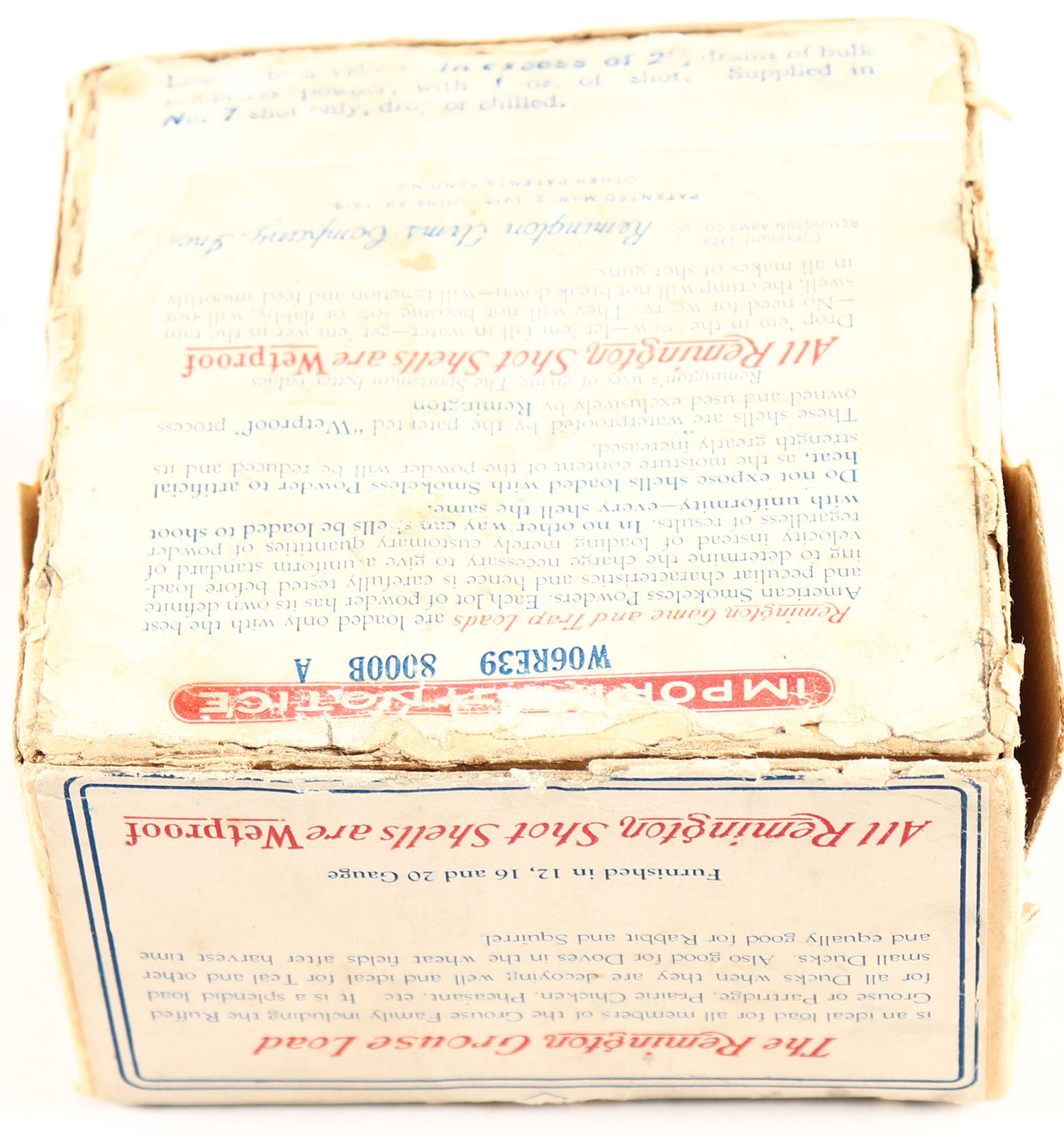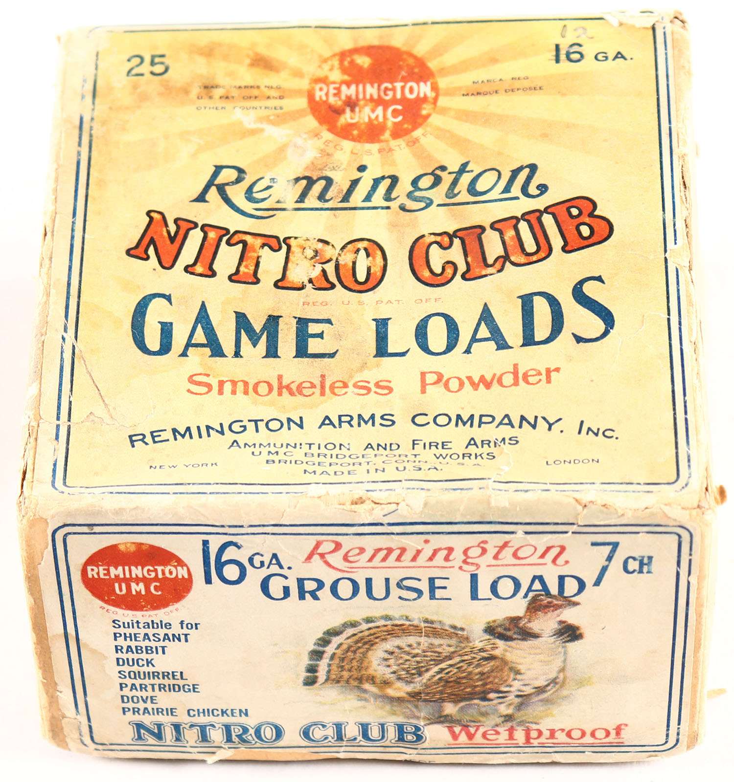 Remington UMC Nitro Club, GAME LOADS, GROUSE LOAD, 12ga., 2pc., Empty, shot size 7CH., buff box with sunburst logo & Ruffed GROUSE on side, box has seam splits, edgewear, with scuffing. Grade: Very Good - Value: 100 to 500