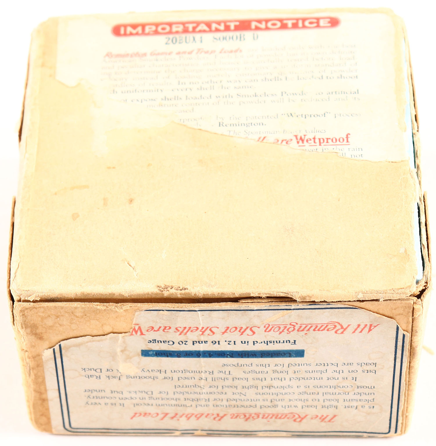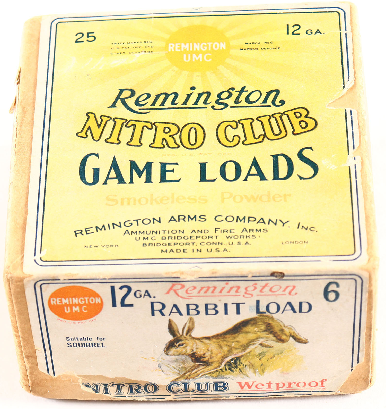 Remington UMC Nitro Club, GAME LOADS, RABBIT LOAD, 12ga., 2pc., Empty, shot size 6 CH, buff box with sunburst logo & RABBIT on side, box is solid with some age soiling, box has one seam split with nice colors. Grade: Very Good - Value: 100 to 400