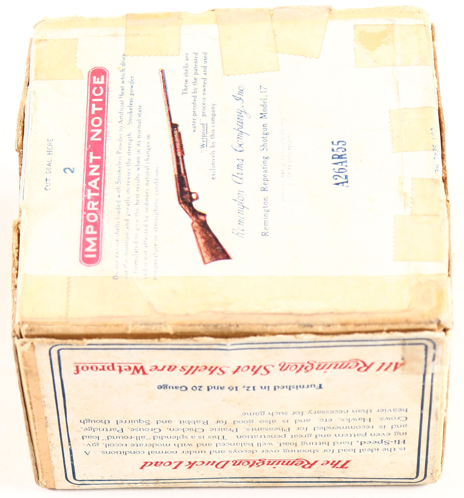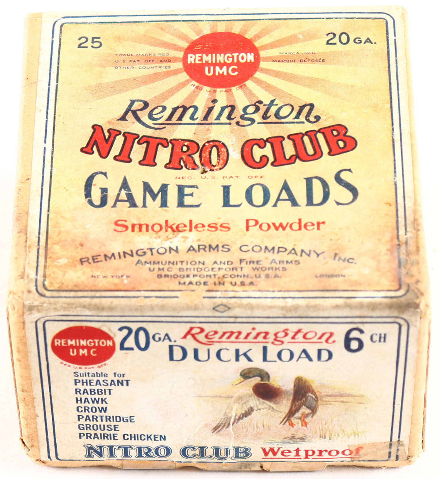 Remington UMC Nitro Club, GAME LOADS, DUCK LOAD, 20ga., 2pc., Full, shot size 6 CH, buff box with sunburst logo & Mallard Landing on side, box is solid, bottom has tape repair, box has scuffing & soiling, shells are very good. Grade: Very Good ++ - Value: 150 to 350
