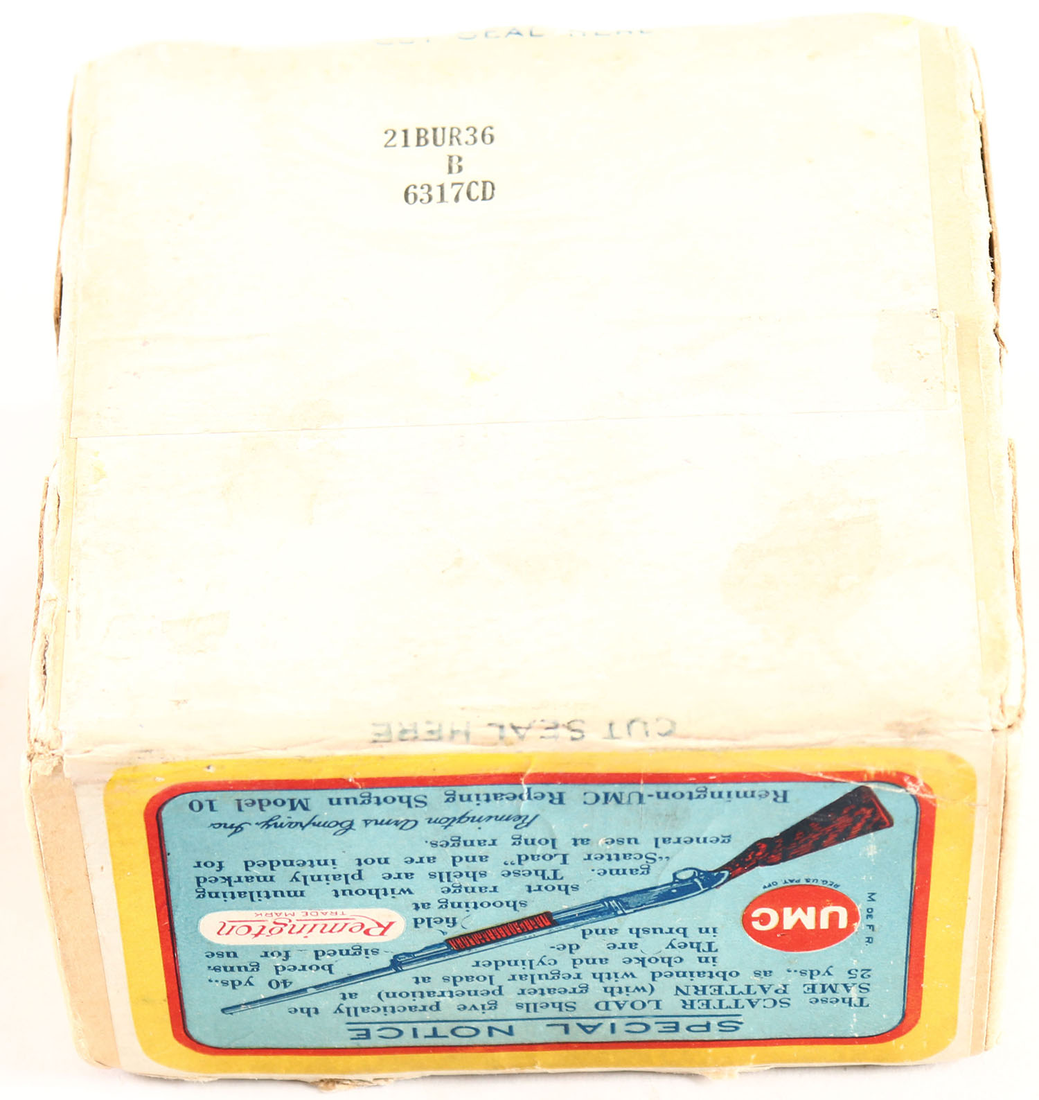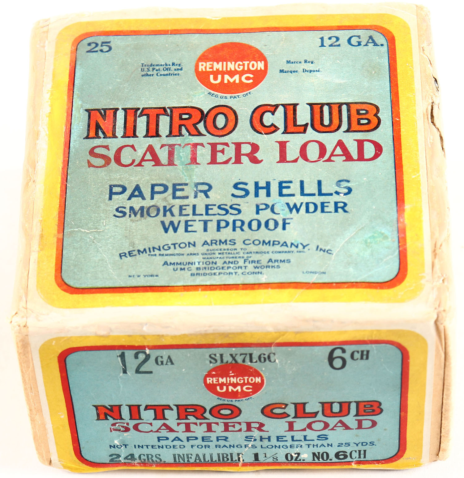 Remington U.M.C., Nitro Club Scatter Load, 12ga., 2pc., FULL & SEALED, shot size 6CH, buff box with blue, yellow, and red colors, box is very solid with age soiling, seam split, light edge wear & very nice colors to label. Grade: Excellent - Value: 200 to 600