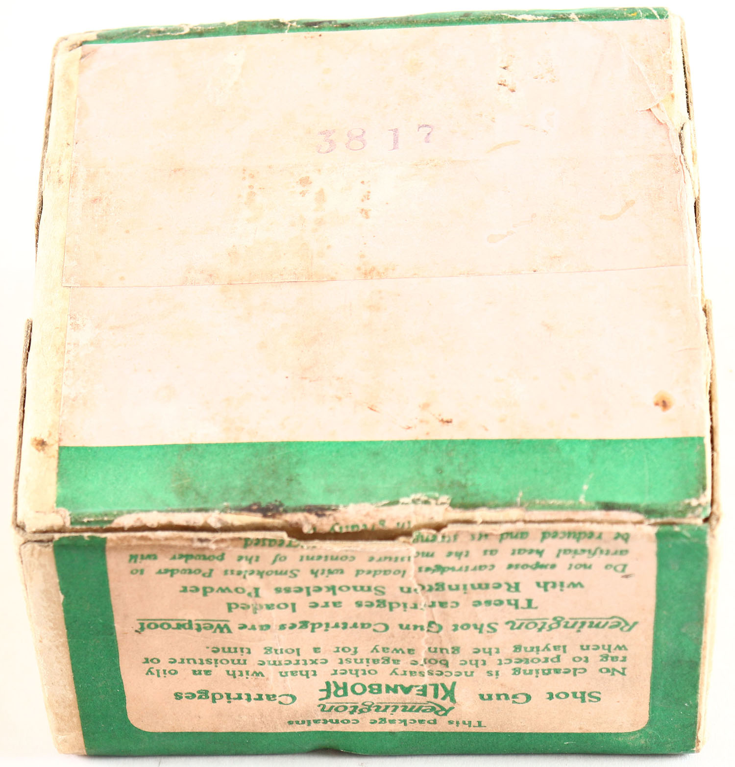 Remington, Kleanbore, LOADED IN ENGLAND, 12ga., 2pc., Empty, shot size 5, buff box with green paper label, box is very solid with age soiling. Grade: Very Good ++ - Value: 40 to 100