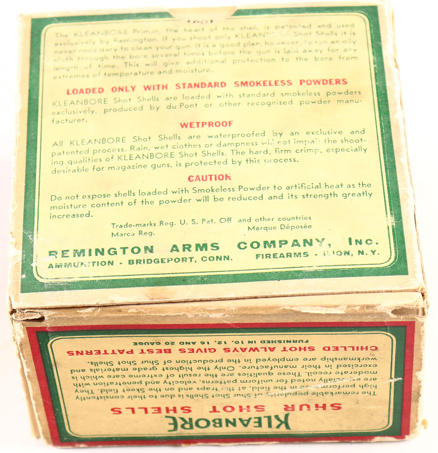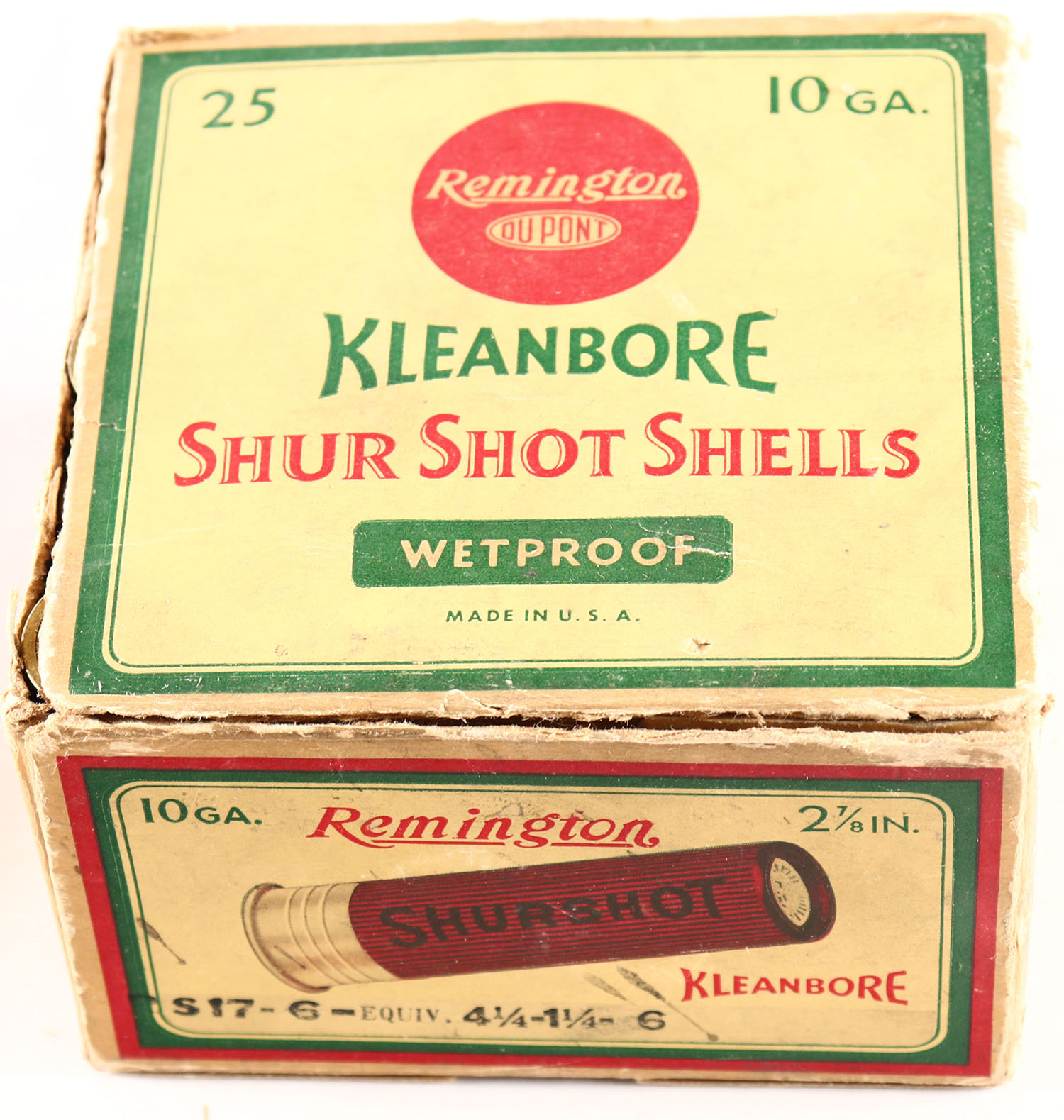 Remington, Kleanbore, SHUR SHOT, 10ga., 1pc., Partial 24rds., shot size 6, box is yellow, red and green, box has seam splits, light soiling & edge wear with very nice colors, shells are good. Grade: Good + - Value: 20 to 80