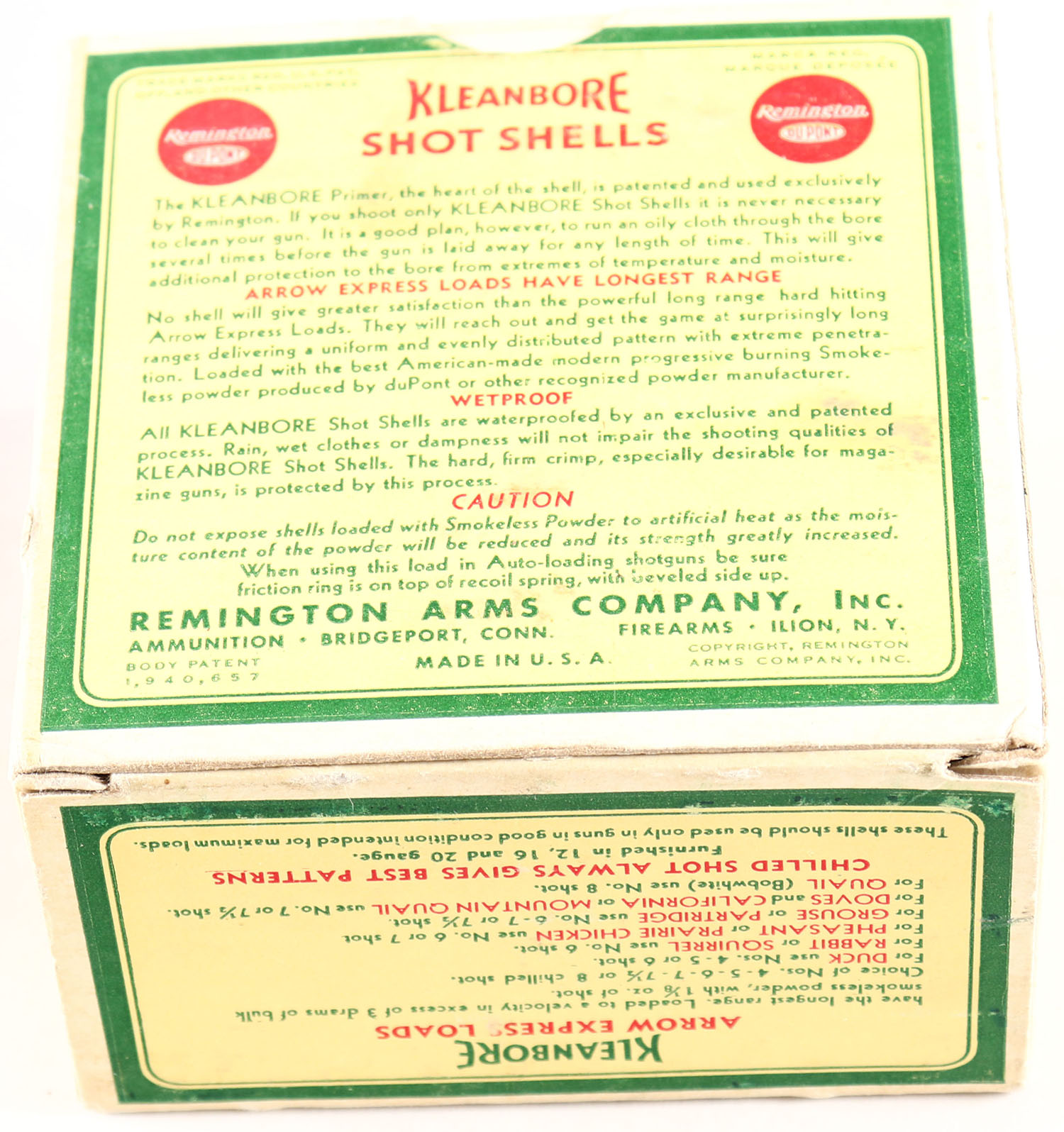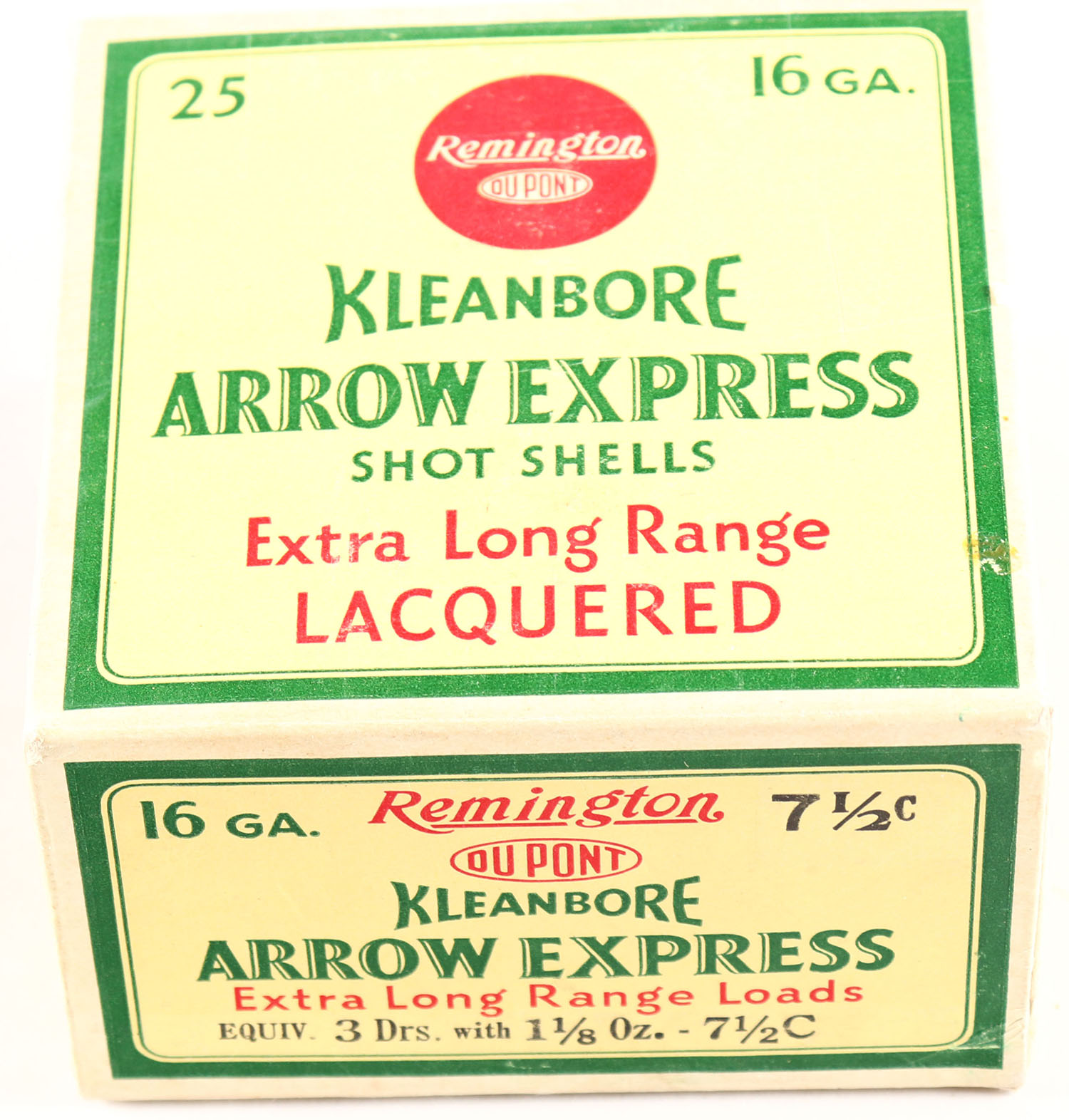 Remington, Kleanbore, ARROW EXPRESS, 16ga., 1pc., Full, shot size 7 1/2C, box is yellow, red and green, box is very solid with great colors, shells are minty. Grade: Excellent ++ - Value: 20 to 60