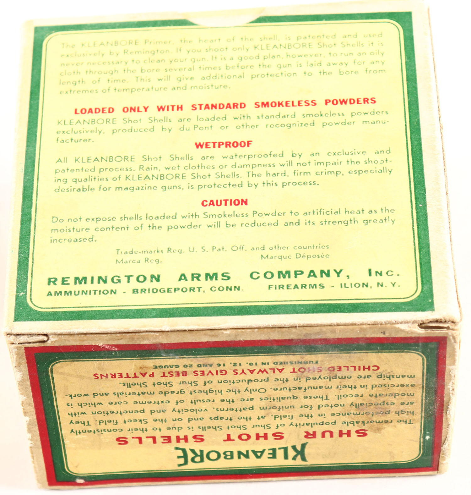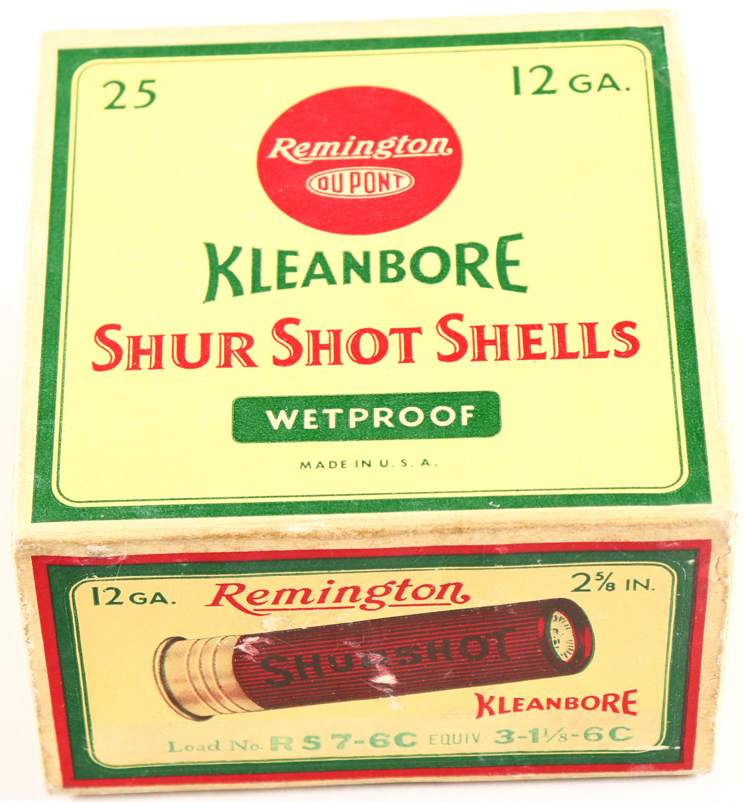 Remington, Kleanbore, SHUR SHOT, 12ga., 1pc., Full, shot size 6C, box is yellow, red and green, box is very solid with very nice colors, shells are excellent. Grade: Excellent ++ - Value: 10 to 60