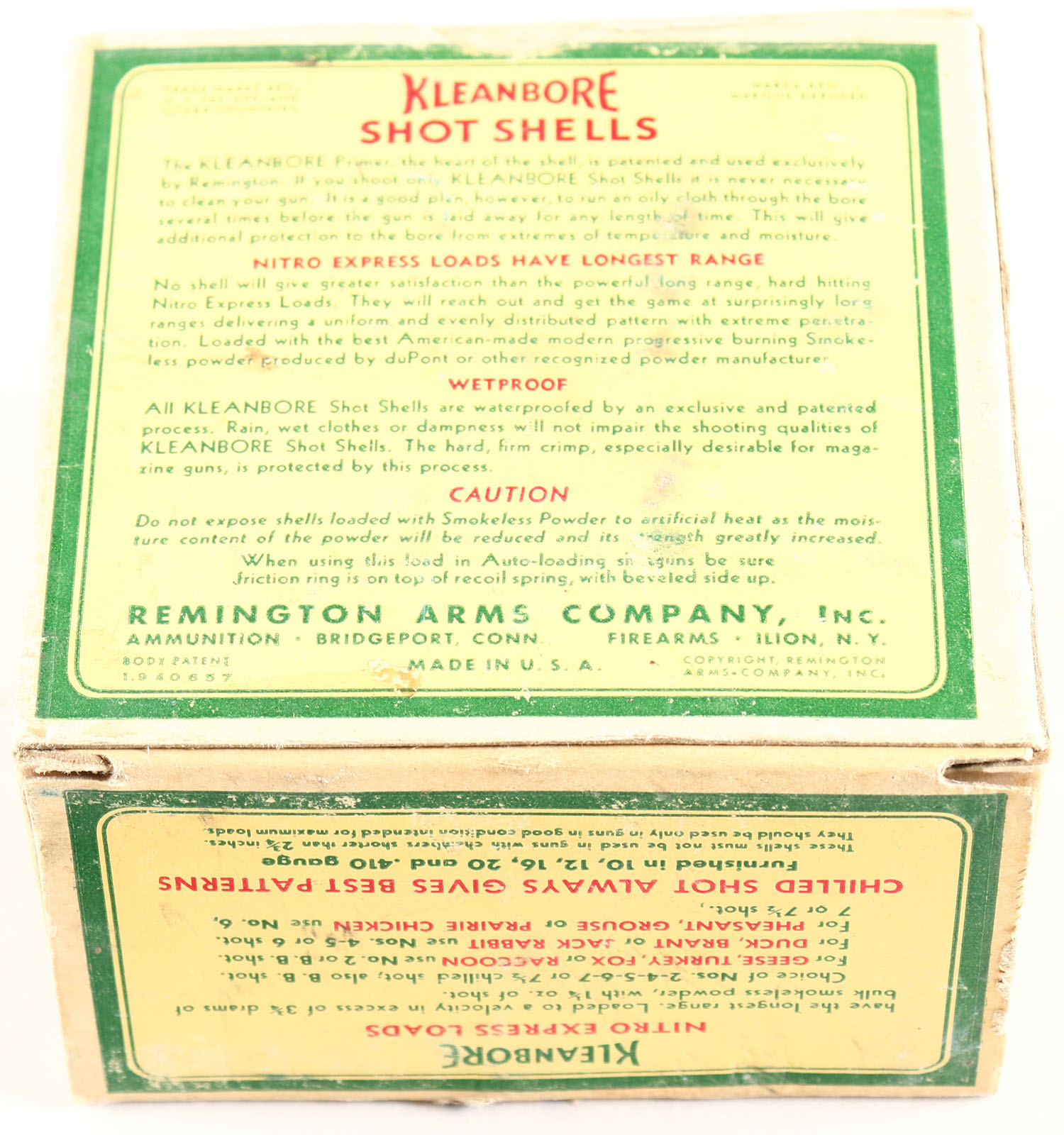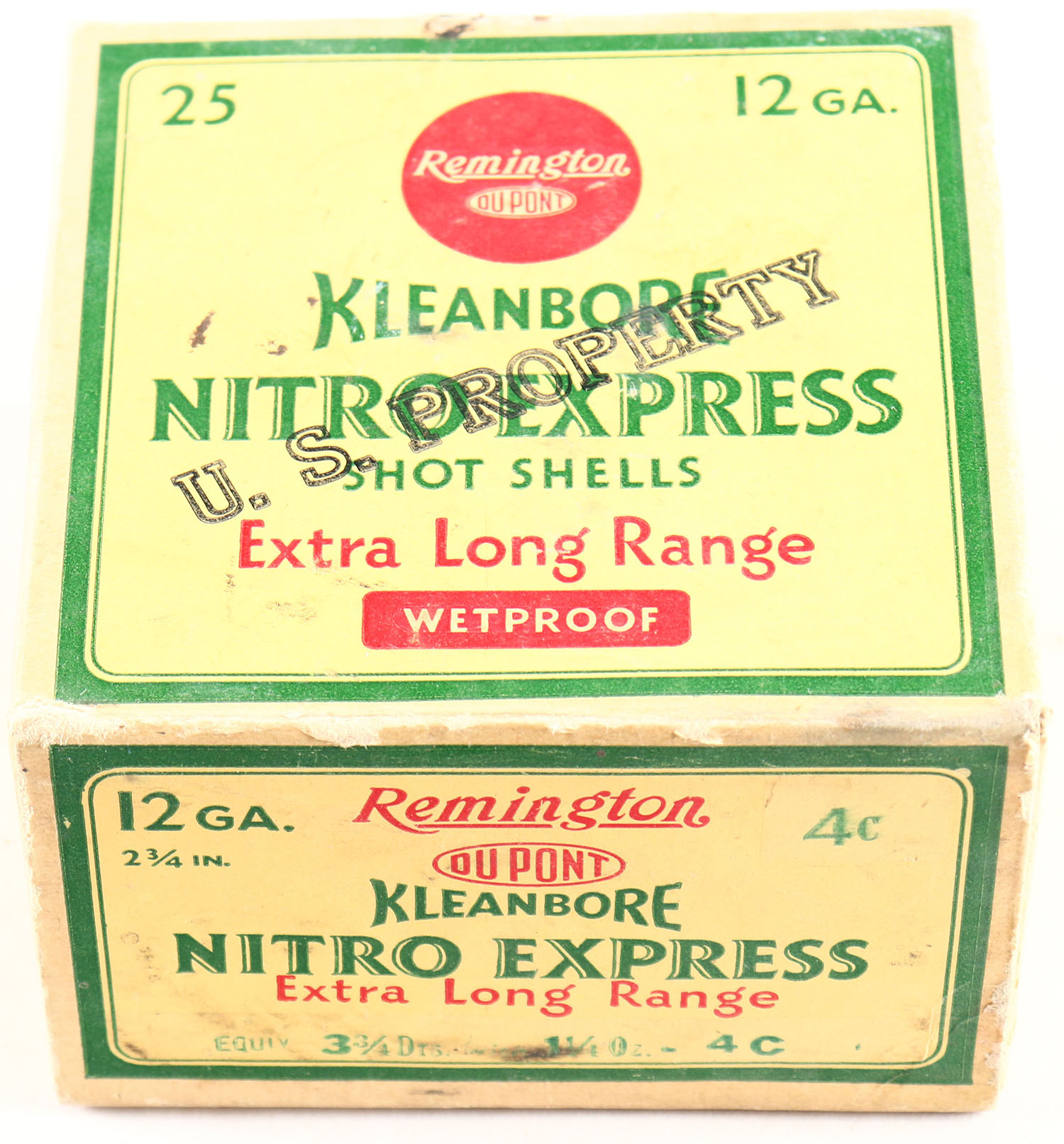 Remington, Kleanbore, NITRO EXPRESS, U.S. Property, 12ga., 1pc., Full, shot size 4C, box is yellow, red and green, box is very solid, has light soiling with great colors, shells are excellent. Grade: Excellent + - Value: 20 to 60