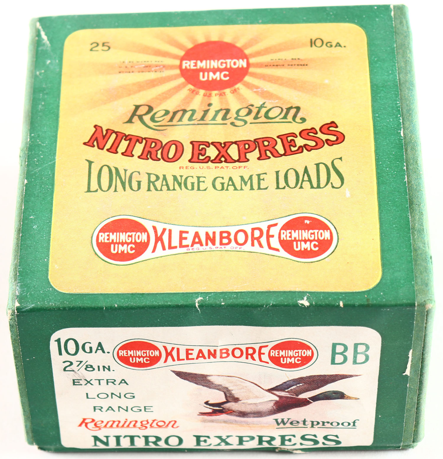 Remington Nitro Express, Long Range Game Loads, pictures Mallard in flight, 10ga., 2pc., FULL & SEALED, shot size BB, green box with sunburst logo & MALLARD on side, box is MINTY. Grade: Excellent ++ - Value: 200 to 500