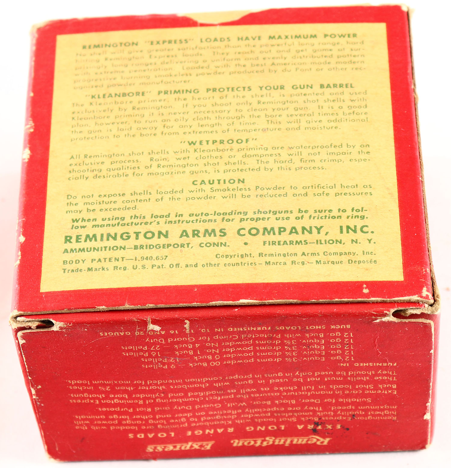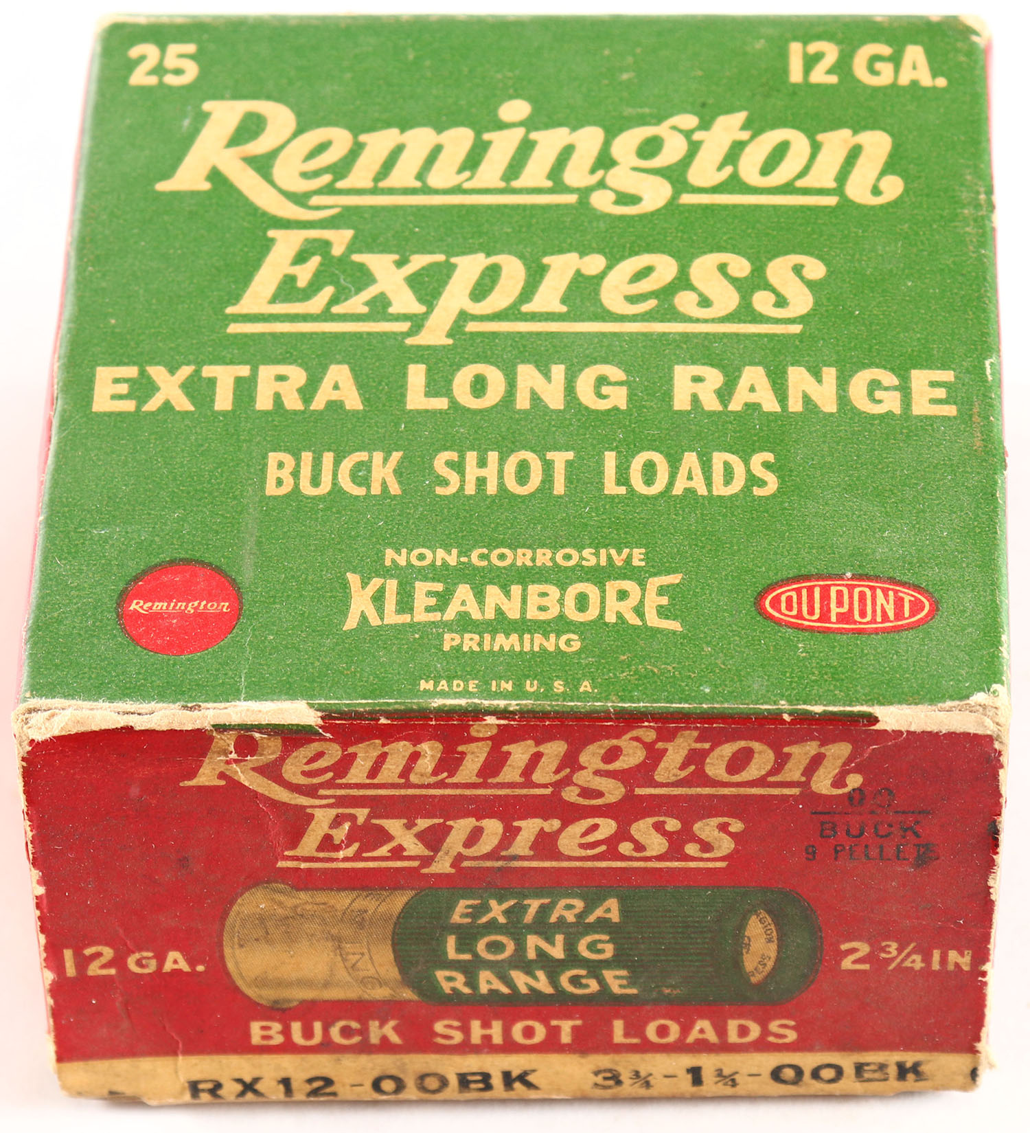 Remington, Express Extra Length, 12ga., 1pc., Partial 17 rds., Shot size 00 BUCK, red and green box, 2 3/4'', box is solid with edge wear, shells are very good. Grade: Very Good ++ - Value: 10 to 20