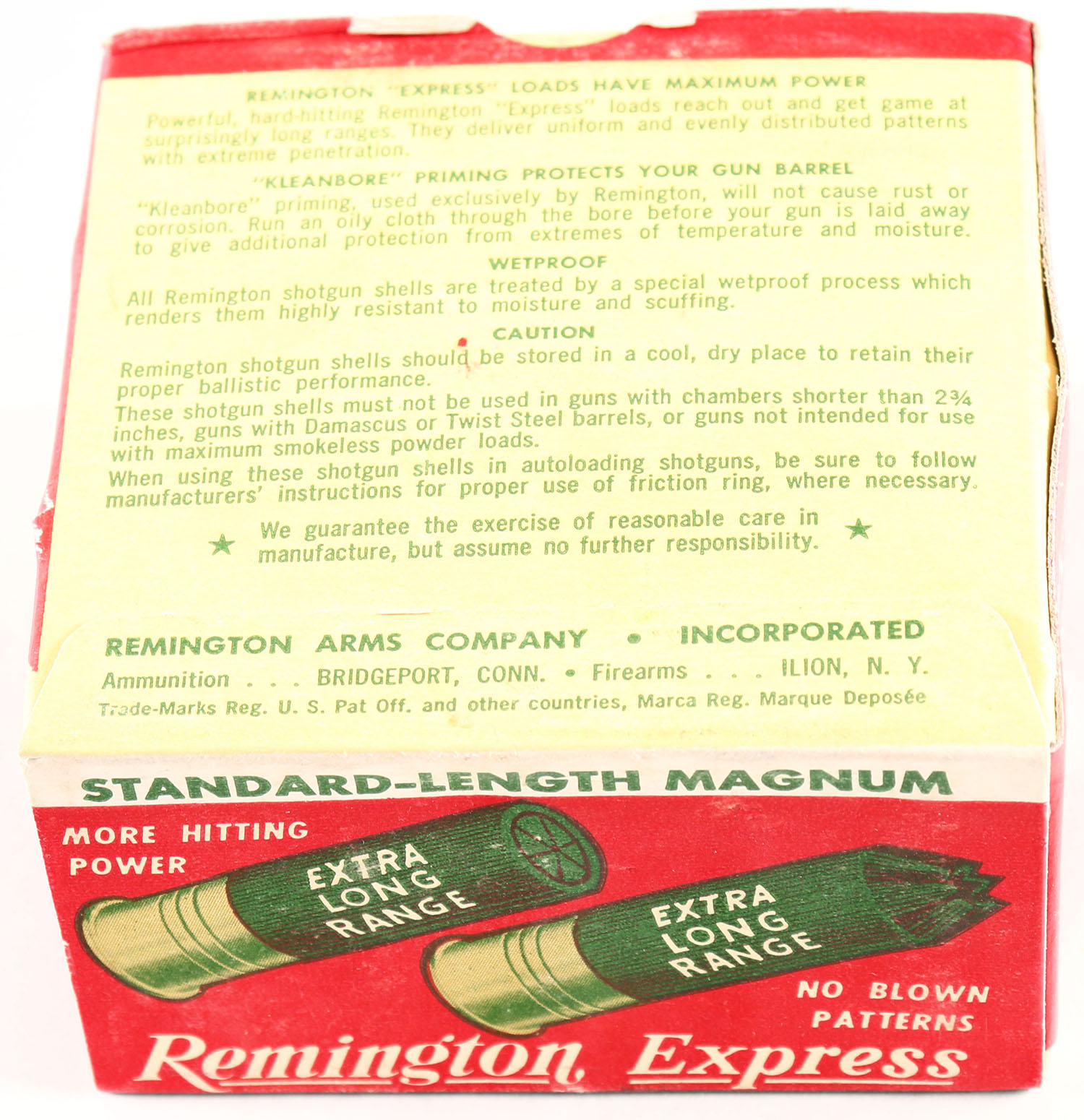 Remington Express, Standard Length Magnum, 12ga., 2 3/4'', 1pc., Full, shot size 2, box is red, white and green, box has some shell protrusion, box is very solid with great colors, shells are excellent. Grade: Excellent - Value: 10 to 40