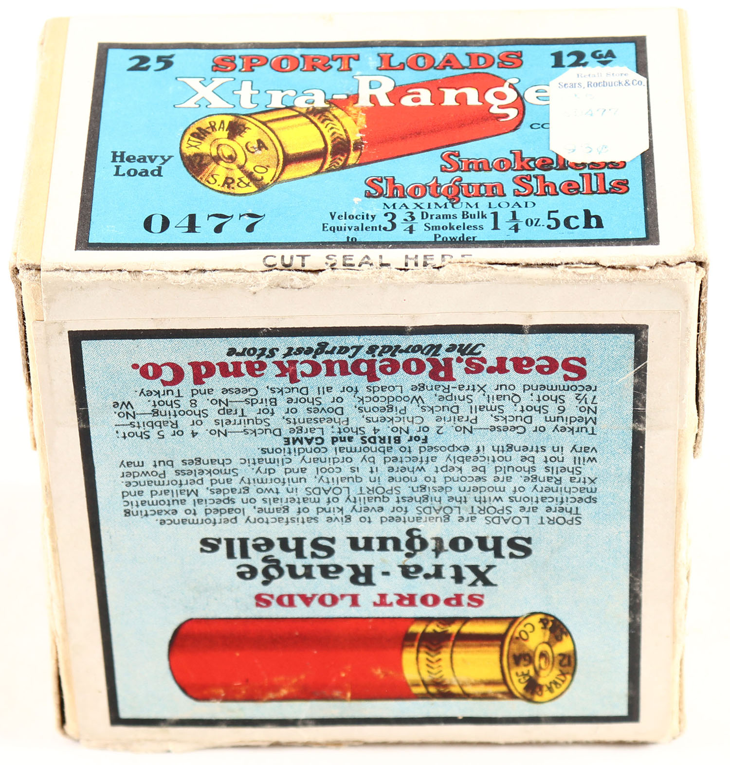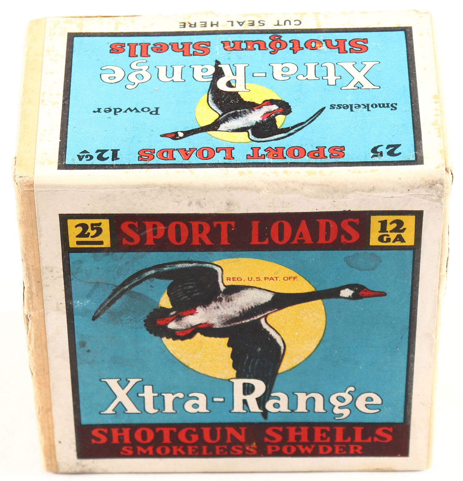 Sears Roebuck & Co., Sports Loads, XTRA-RANGE, 12ga., 2pc., Empty, shot size 5 Ch, buff box with multi colored label that pictures a Goose flying with a yellow moon in background, box has light soiling & light scuffing with very nice colors. Grade: Excellent - Value: 100 to 400