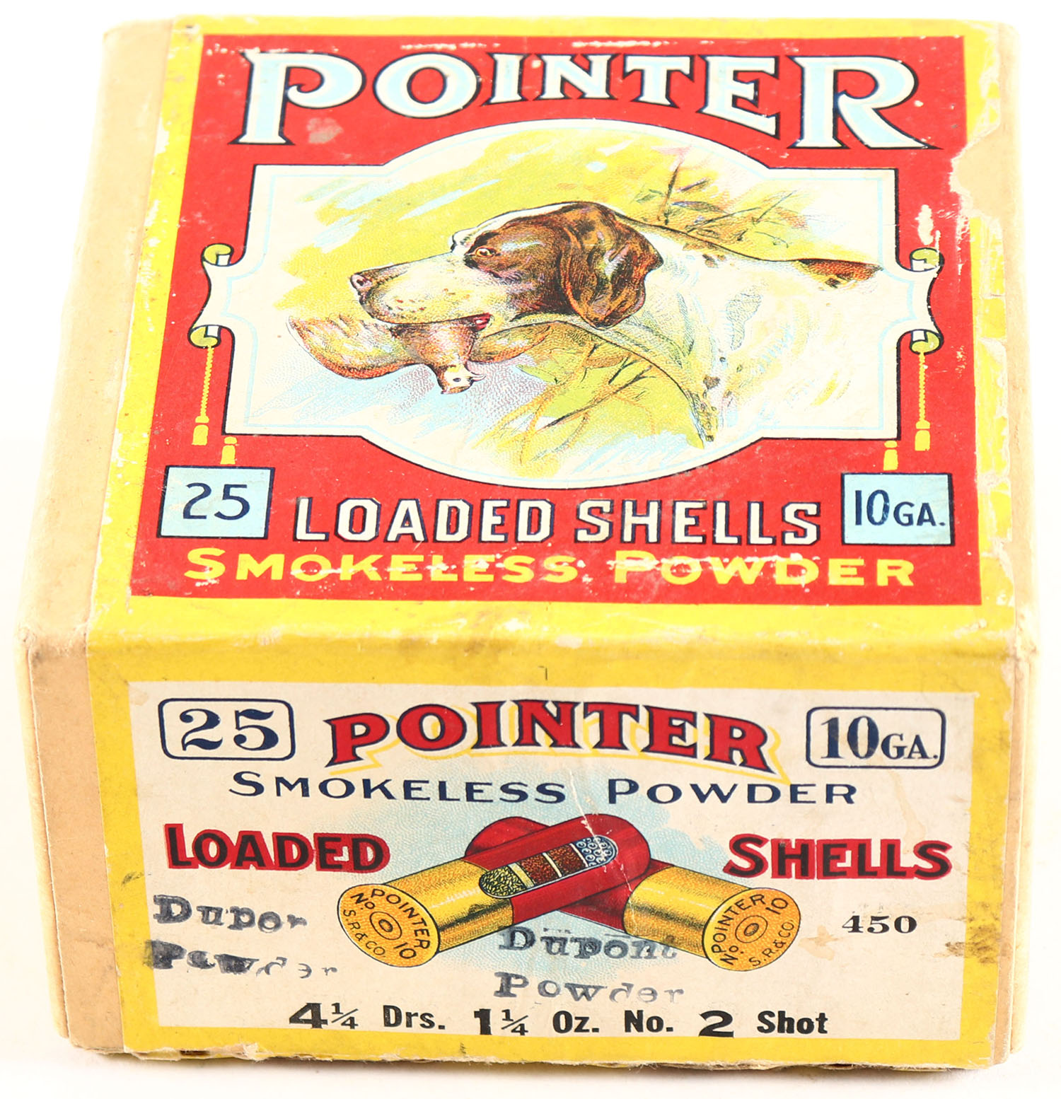 Sears. Roebuck & Co., POINTER, 10ga., 2pc., Full, shot size 2, buff box with multi-colored label of a dog holding a quail, box is solid with light age soiling & light scuffing, sides picture crossed shells & a dog on point, label is 100% intact, shells are excellent. Grade: Excellent + - Value: 200 to 600